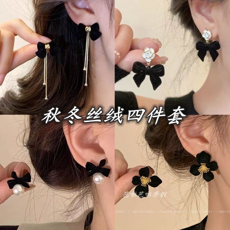 丝绒蝴蝶结耳夹女气质流苏耳环小众设计感高级秋冬耳钉无耳洞耳饰
