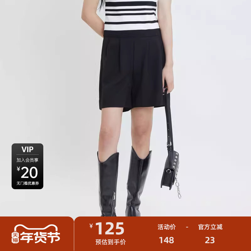 sdeer圣迪奥女装复古高腰压褶A字黑色短裤S24280904