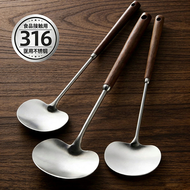 永尖316不锈钢加厚锅铲胡桃木长柄蘑菇铲炒菜铲厨房炒勺家用厨具