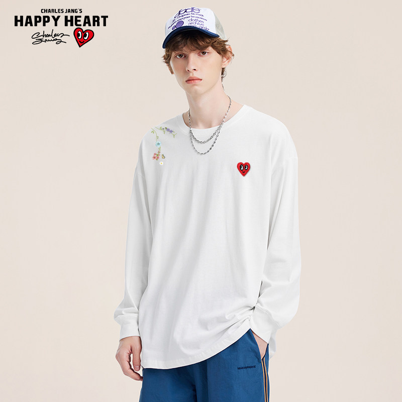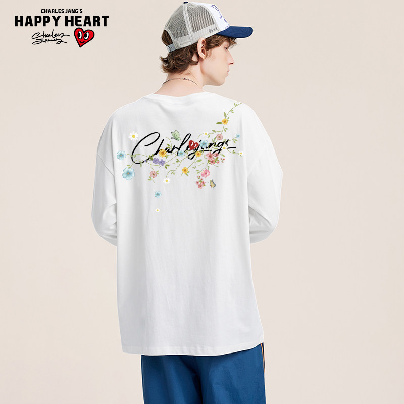 查尔斯桃心 美式花卉印花纯棉圆领长袖T恤男女春秋休闲情侣款上衣