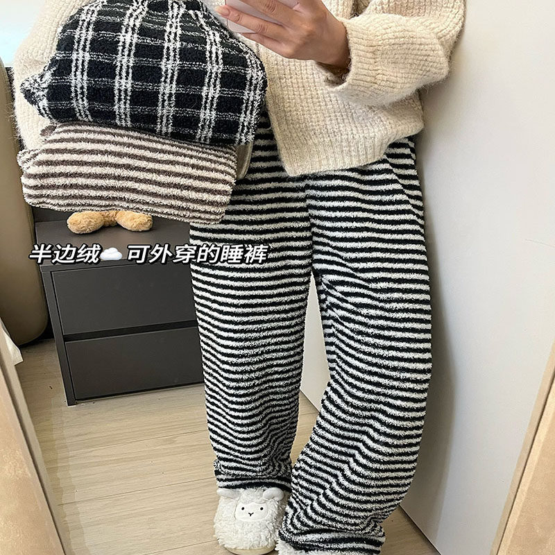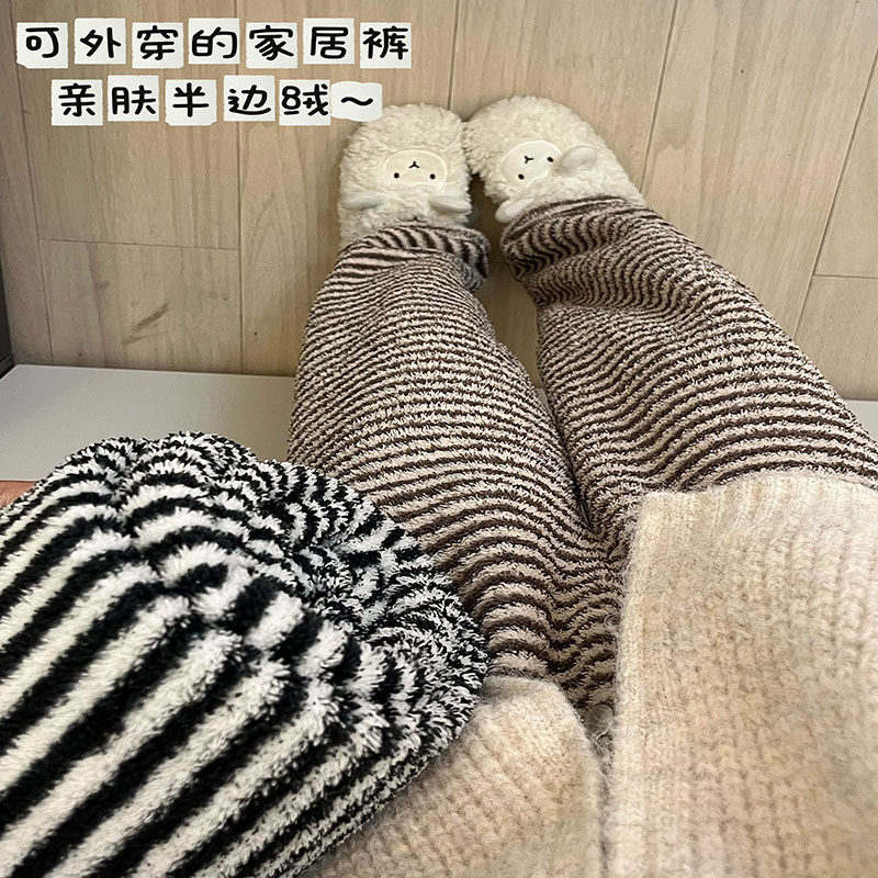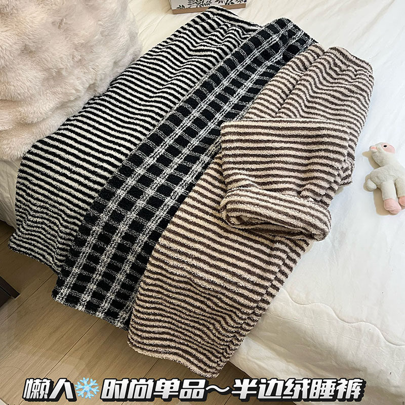 半边绒睡裤女款秋冬季长裤加绒复古慵懒家居裤可外穿暖暖裤条纹