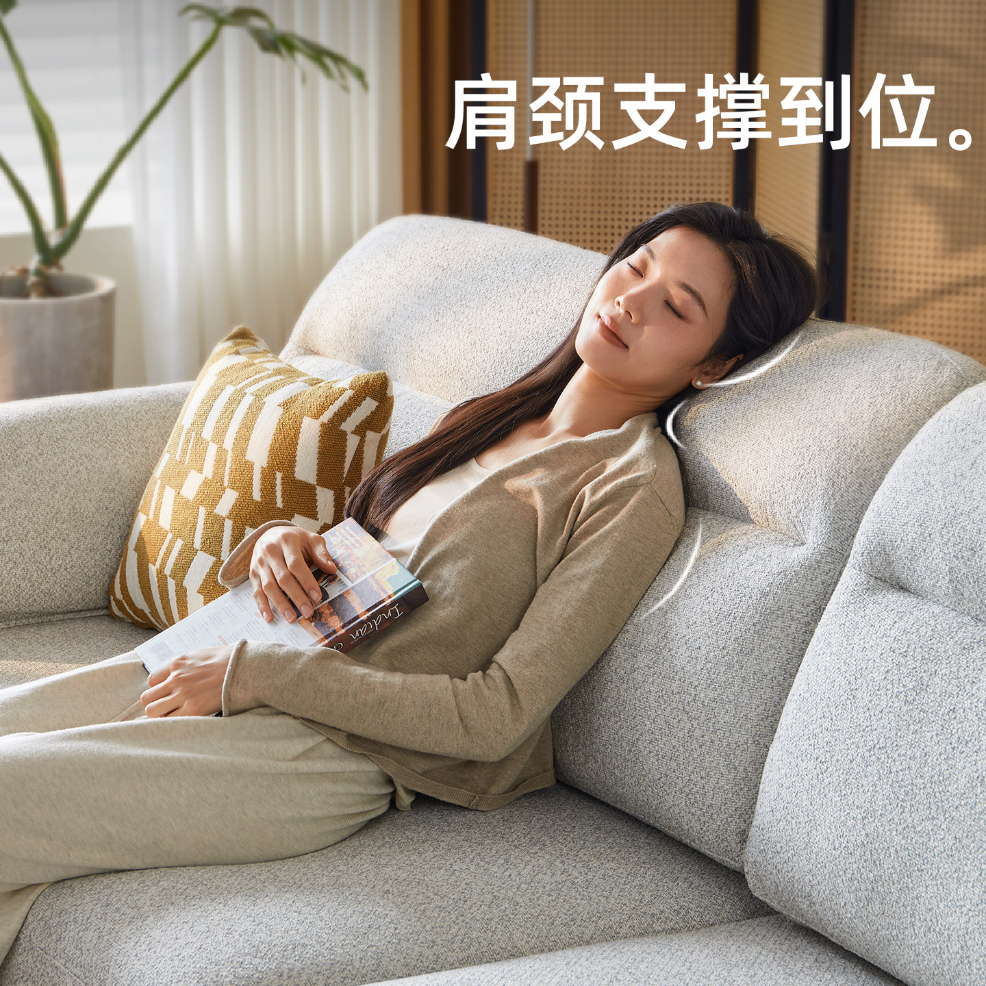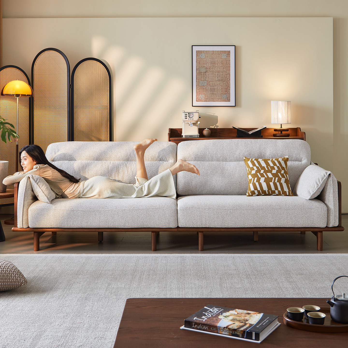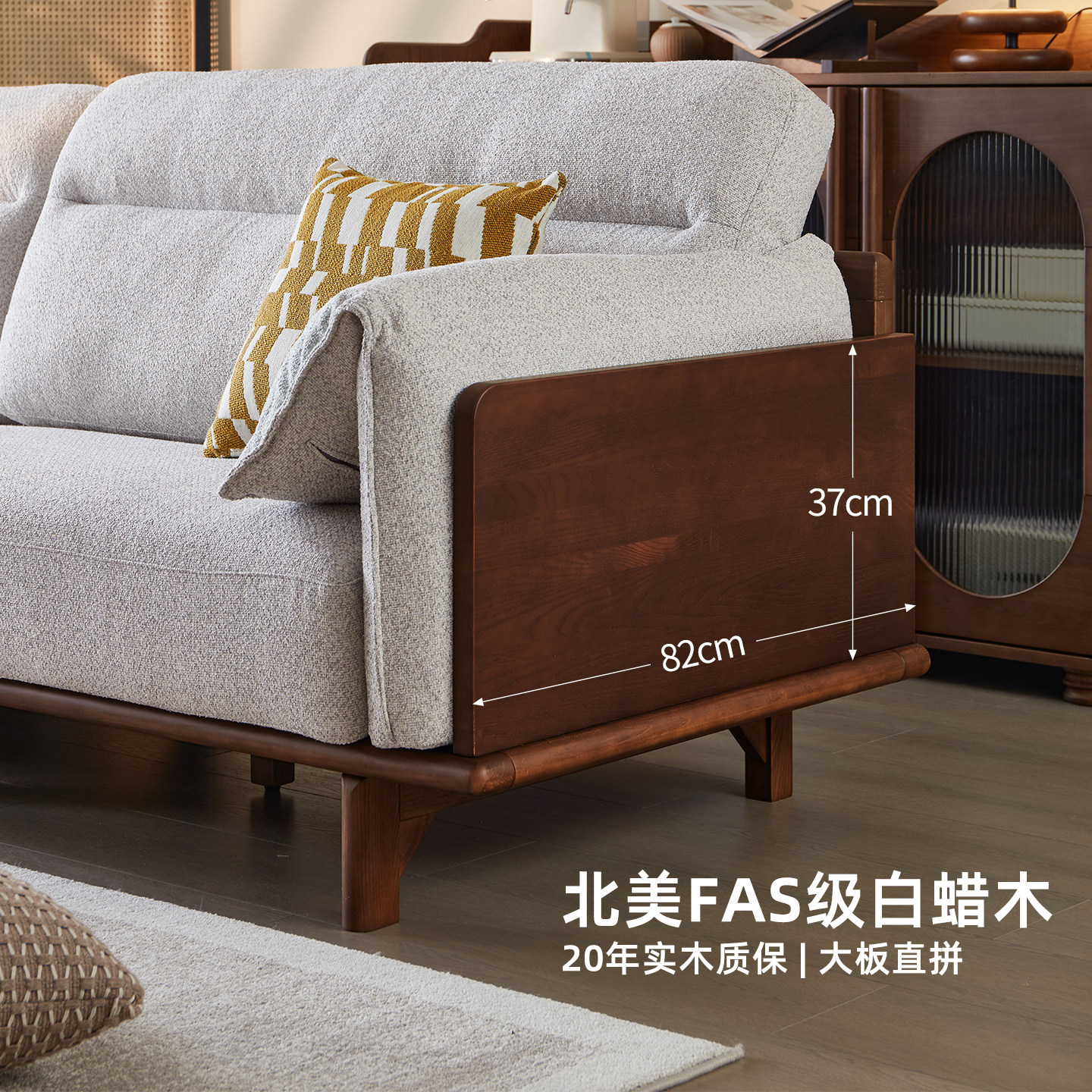 一林半舍白蜡木全实木沙发四人位客厅家用可拆洗大象耳布艺沙发