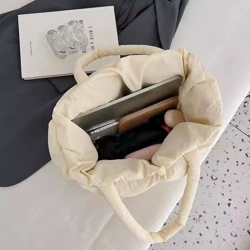 欧美潮小众设计方格柔软充棉托特包手提单肩包时尚棉服包云朵