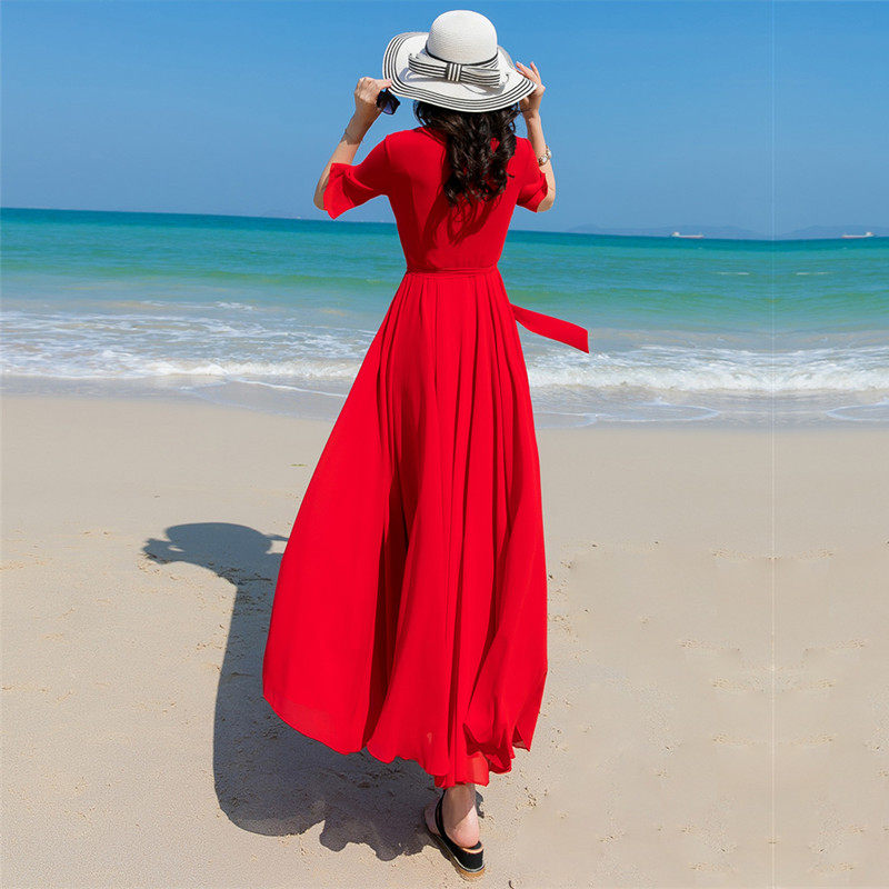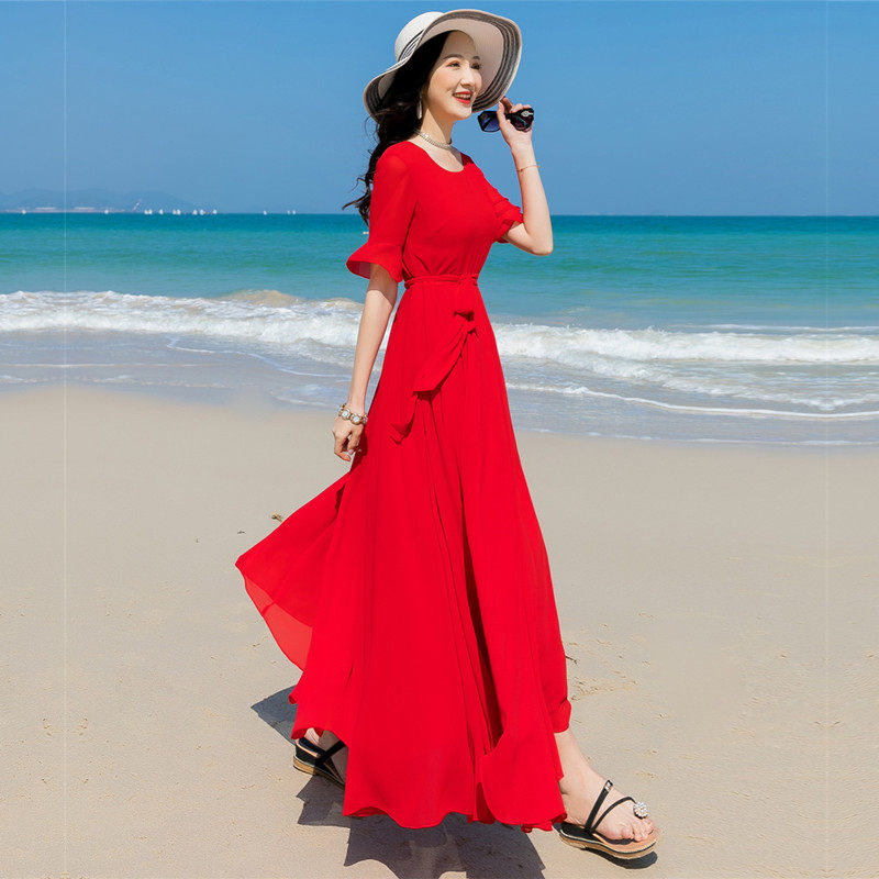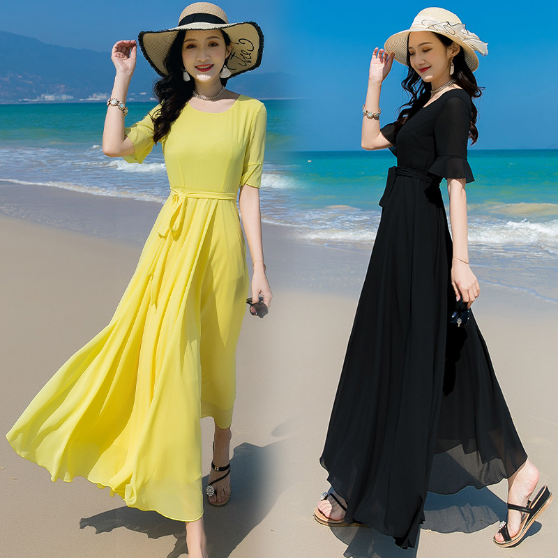 2025夏季新款五分袖气质雪纺连衣裙收腰显瘦长款大摆度假长裙女夏