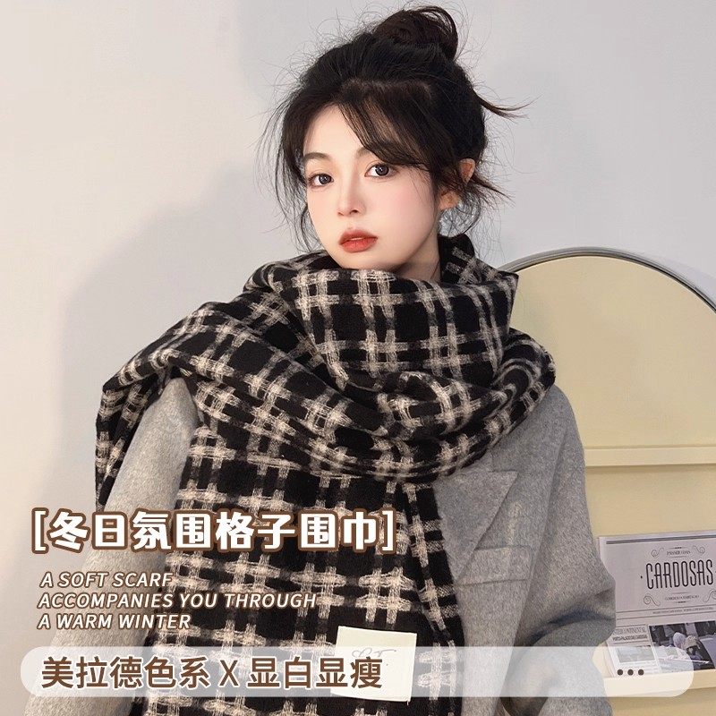 围巾秋冬季女氛围感2025新款黑白格子韩系情侣保暖加厚围脖男圣诞