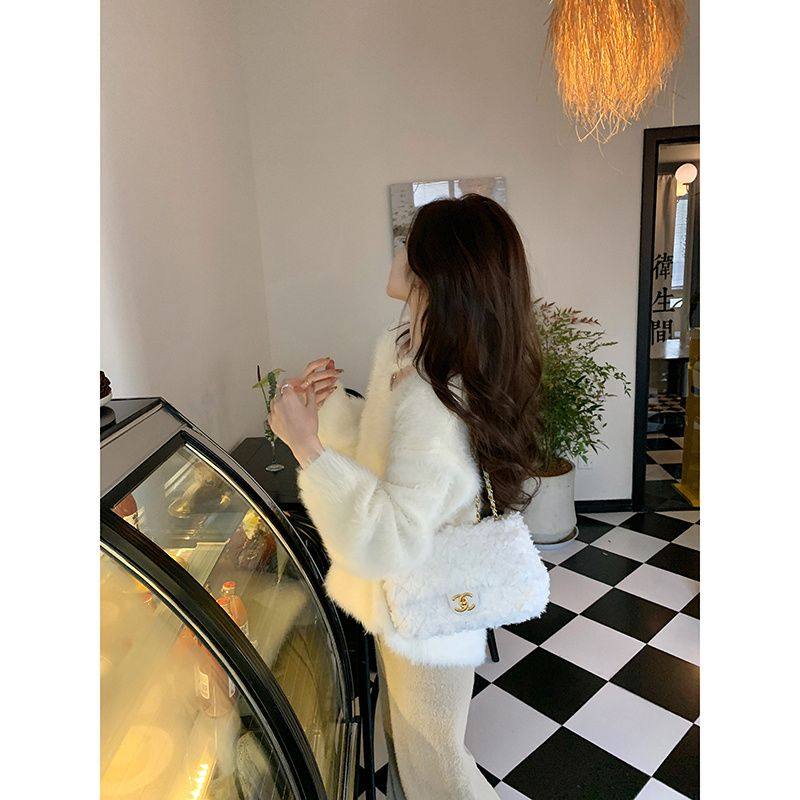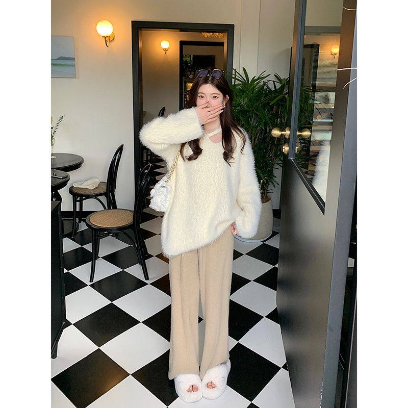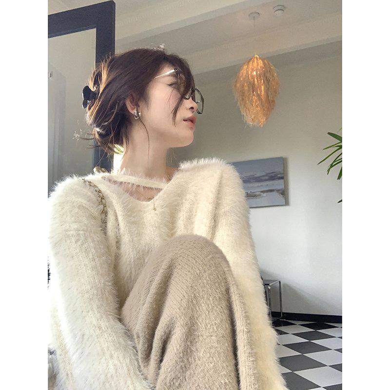 斜V领设计感水貂绒针织毛衣女秋冬厚实宽松大码内搭奶fufu上衣