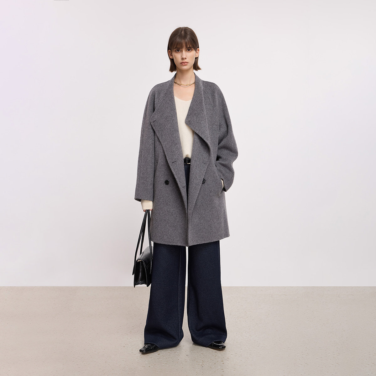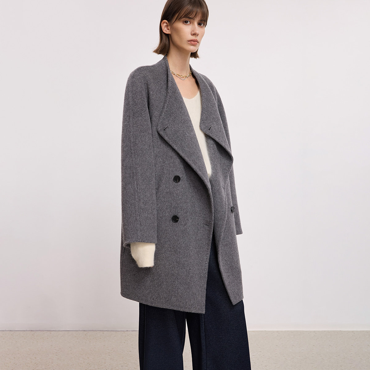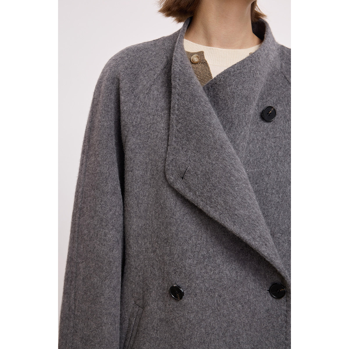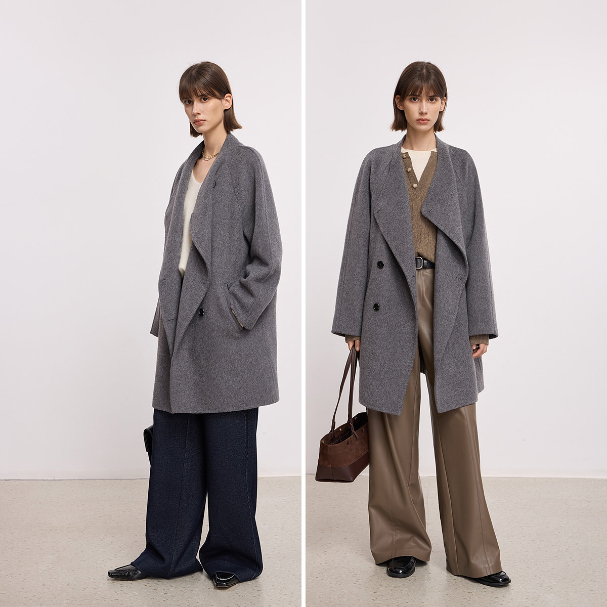 RUISHI芮时重磅驼绒桑蚕丝羊毛慵懒两穿领灰色毛呢大衣秋冬外套女