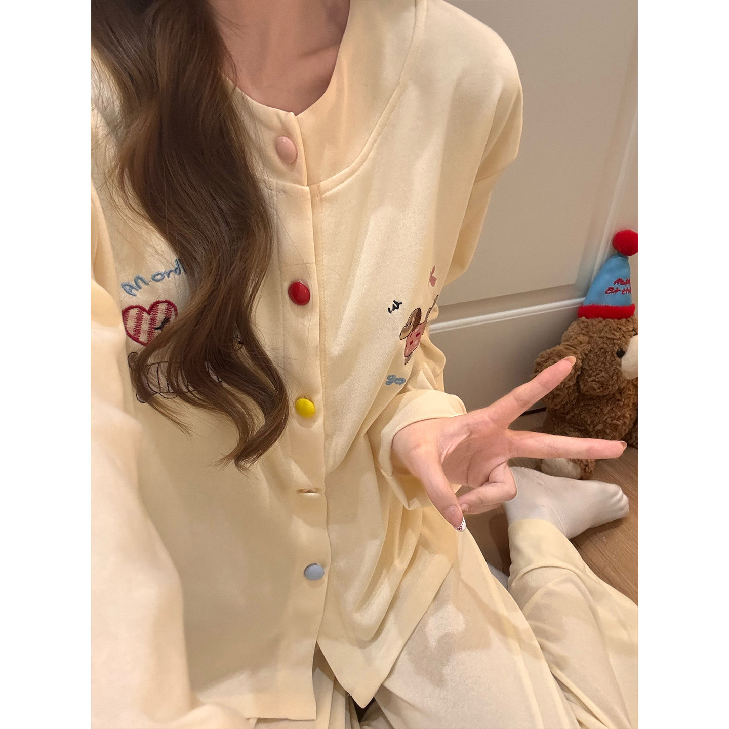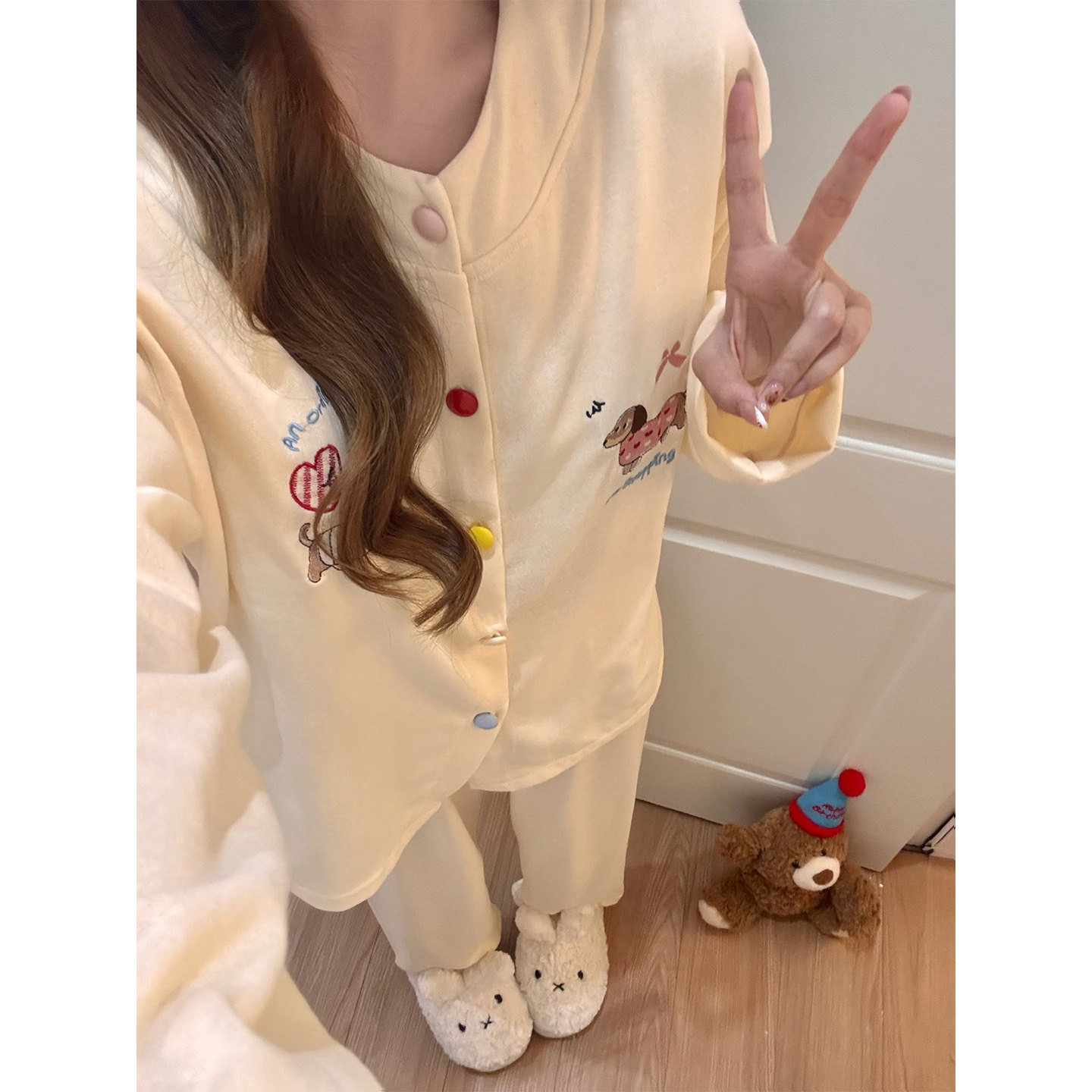 【清仓价】春长袖睡衣女双面舒棉绒开衫家居服套装大码长裤可外穿