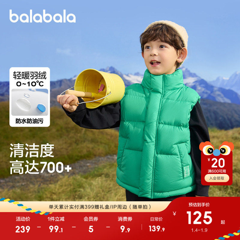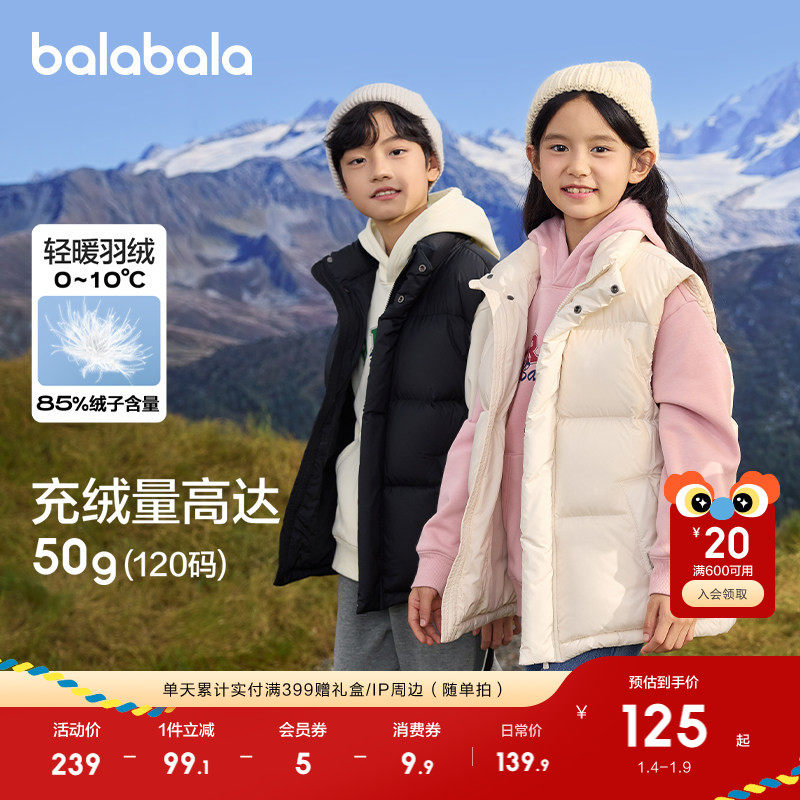 巴拉巴拉童装儿童羽绒马甲女童男童外穿新款2025冬装高充绒保暖潮