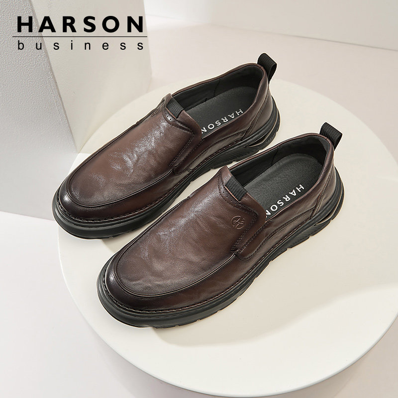 哈森男鞋头层牛皮皮鞋男士2026新款鞋子单鞋黑色英伦一脚蹬乐福鞋