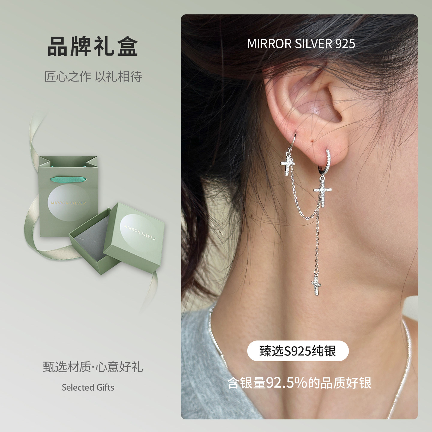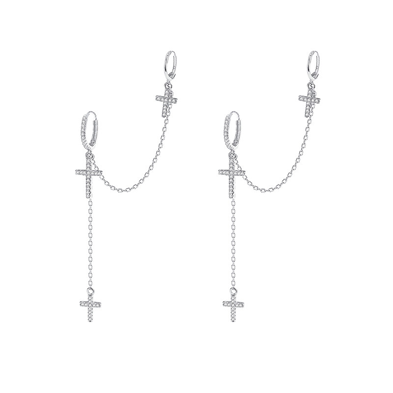 小麋人925纯银双耳洞十字架耳扣方形耳钉女耳环耳饰ins风耳圈网红