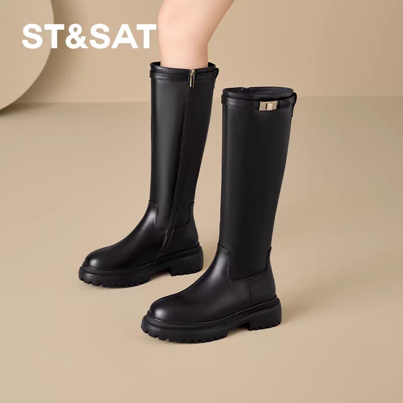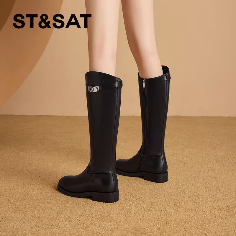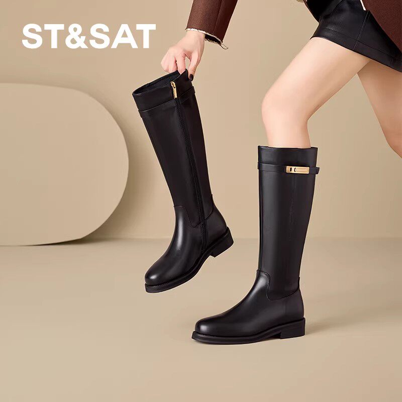 真皮~骄屿秋冬新款皮带扣长筒靴女通勤不过膝骑士靴低跟复古长靴
