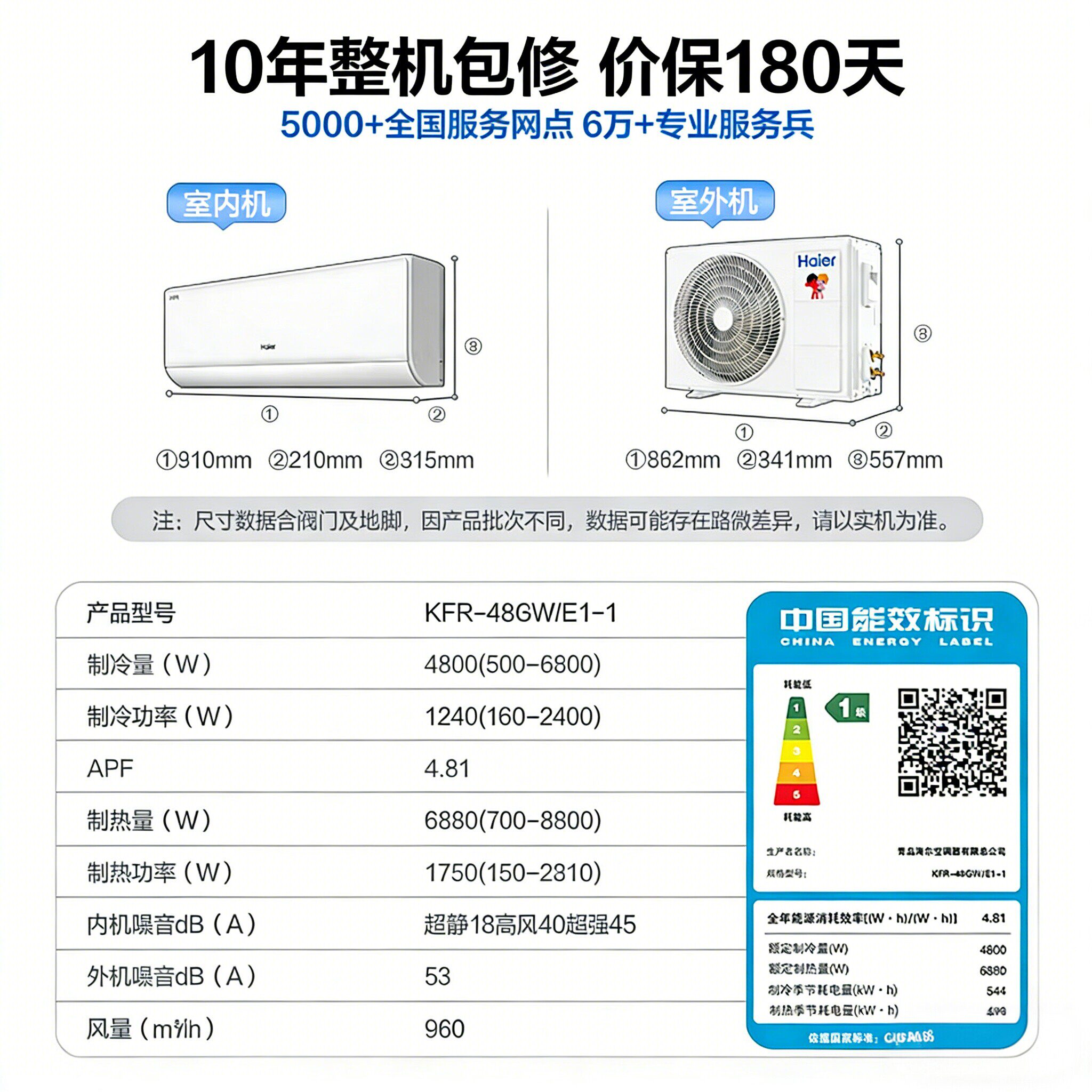 【纯铜管】海尔空调1.5匹1匹一级变频冷暖卧室挂机净省电E1旗舰店