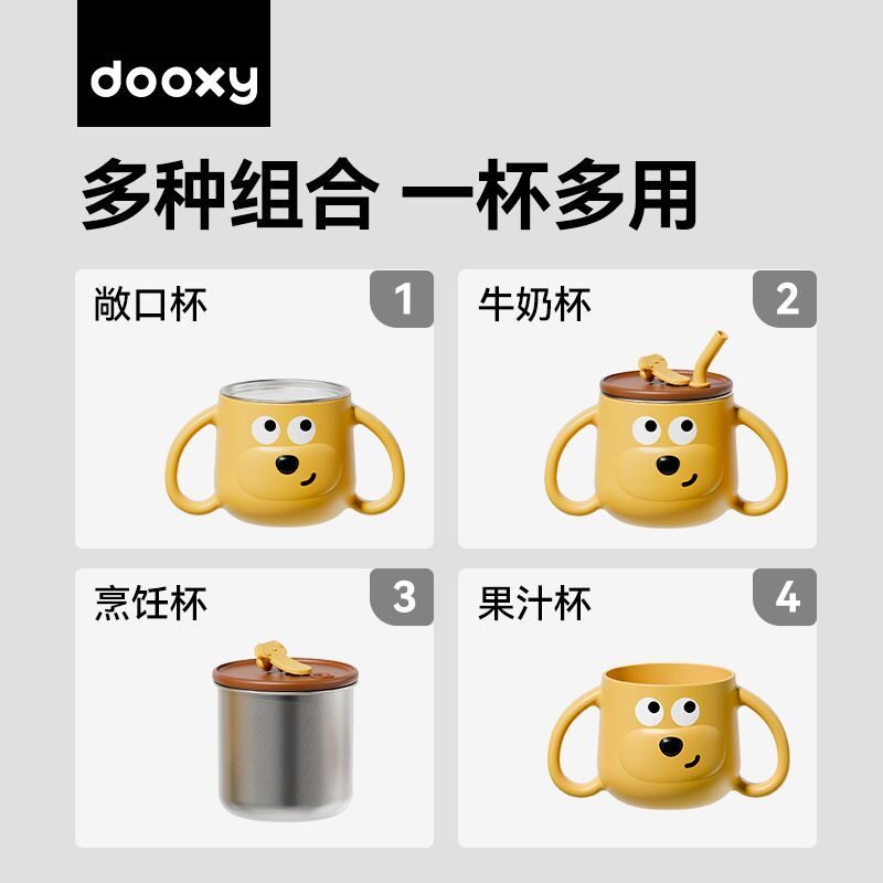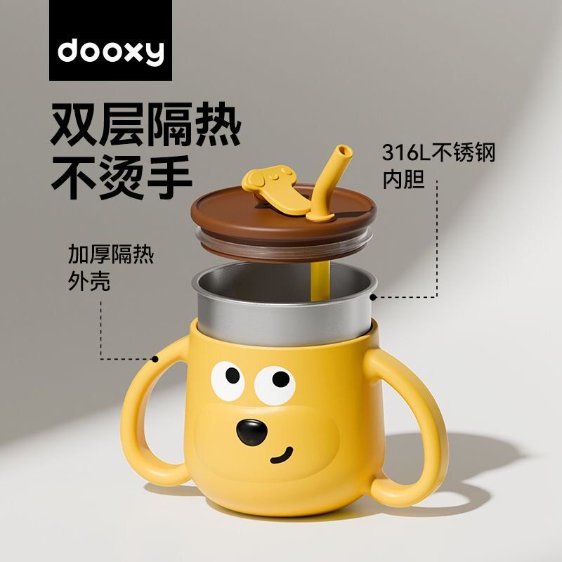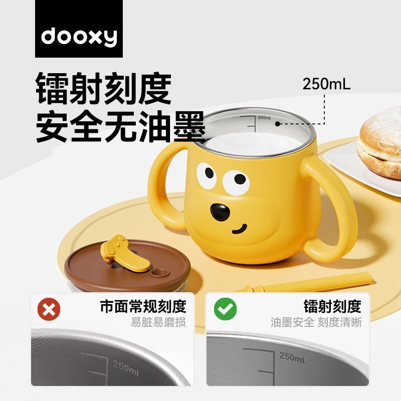 dooxy儿童水杯宝宝喝奶敞口带刻度316L不锈钢防摔家用学饮吸管杯