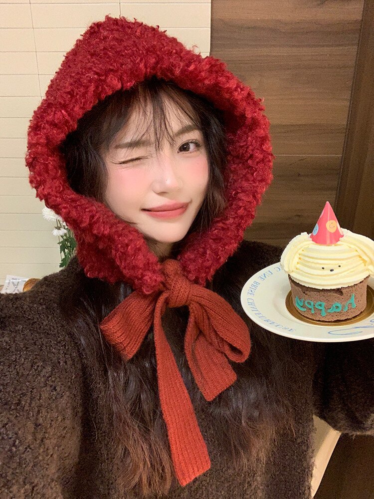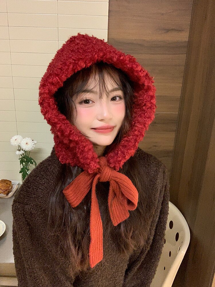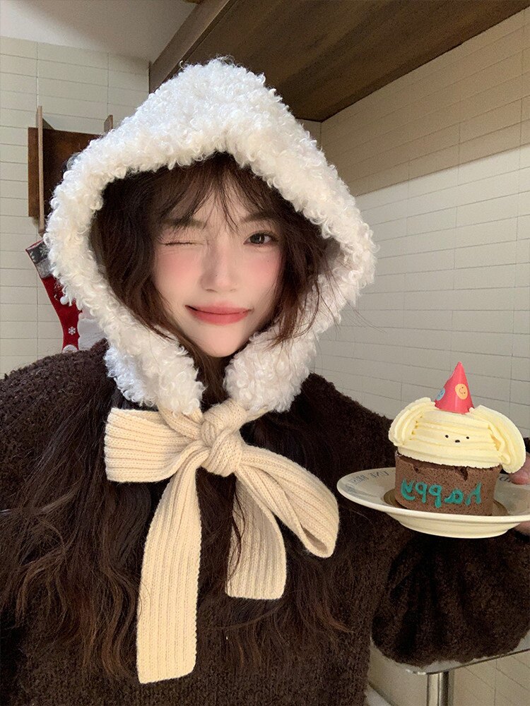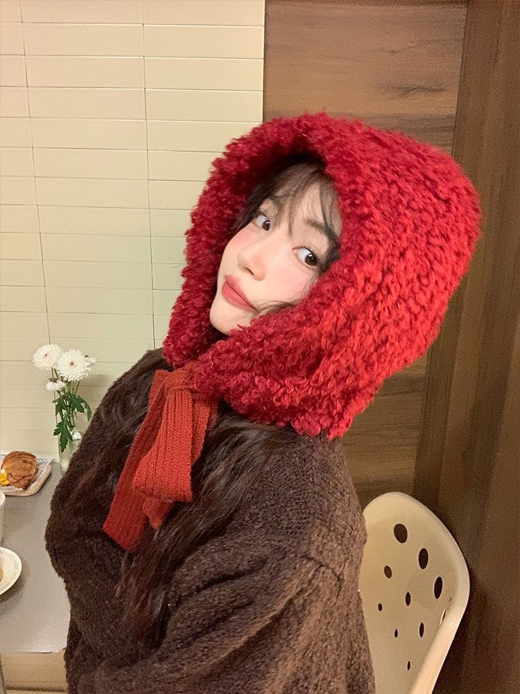 羊羔毛可爱圣诞新年款包头护耳帽2023新款毛绒保暖防寒绑带帽子女