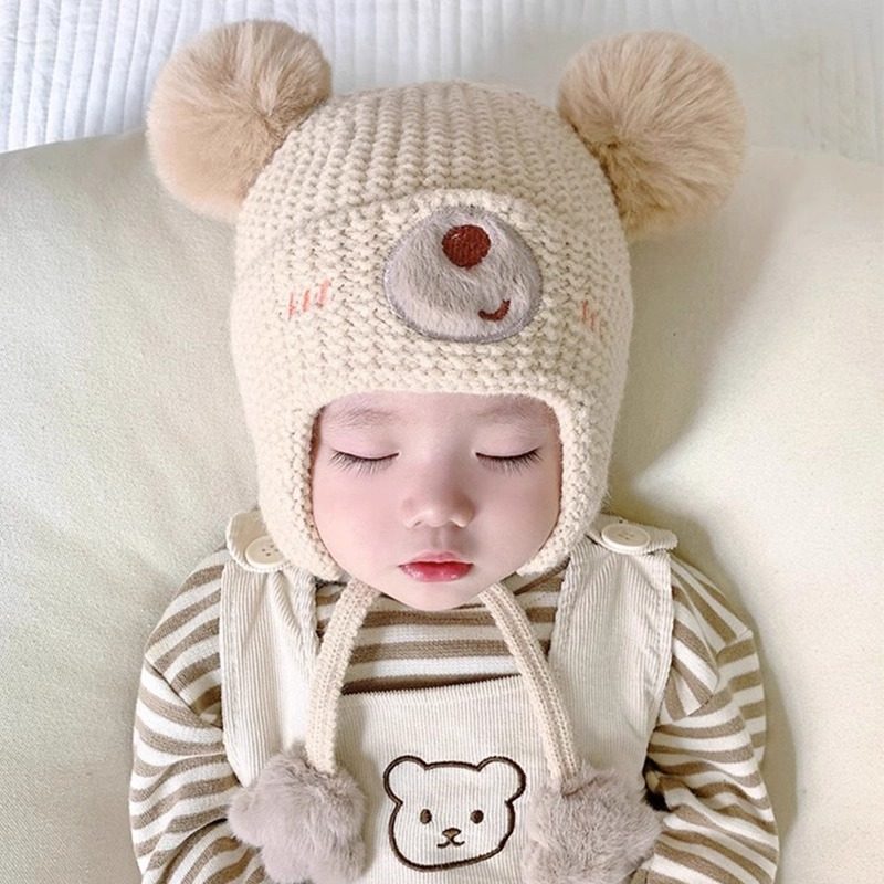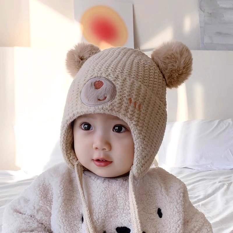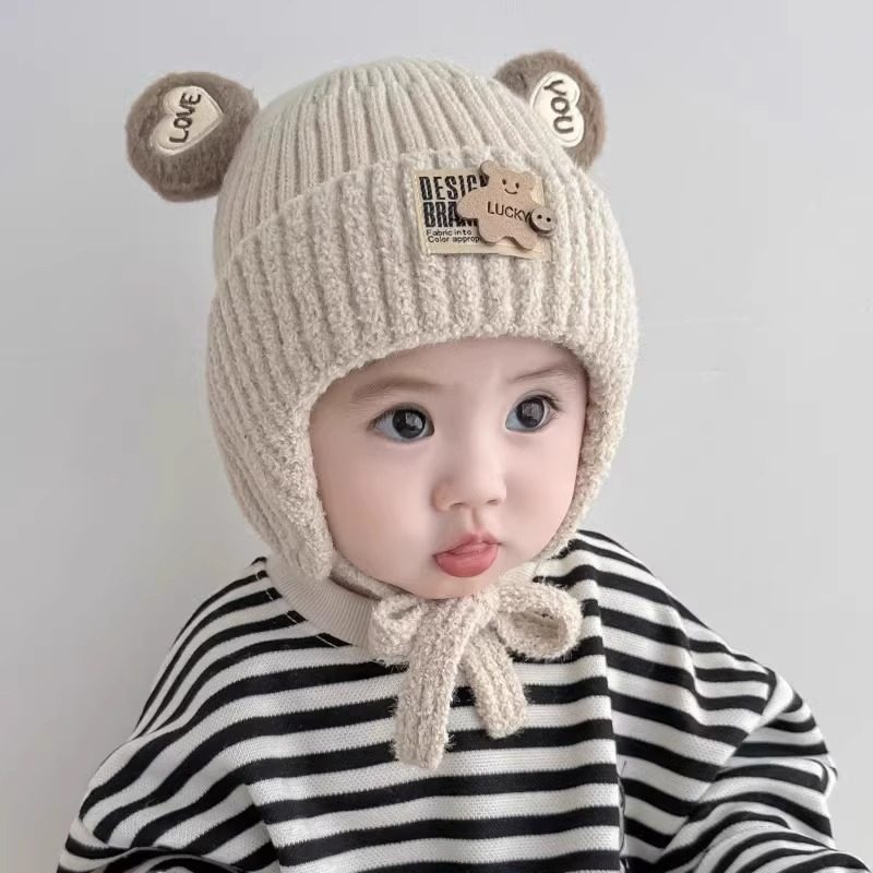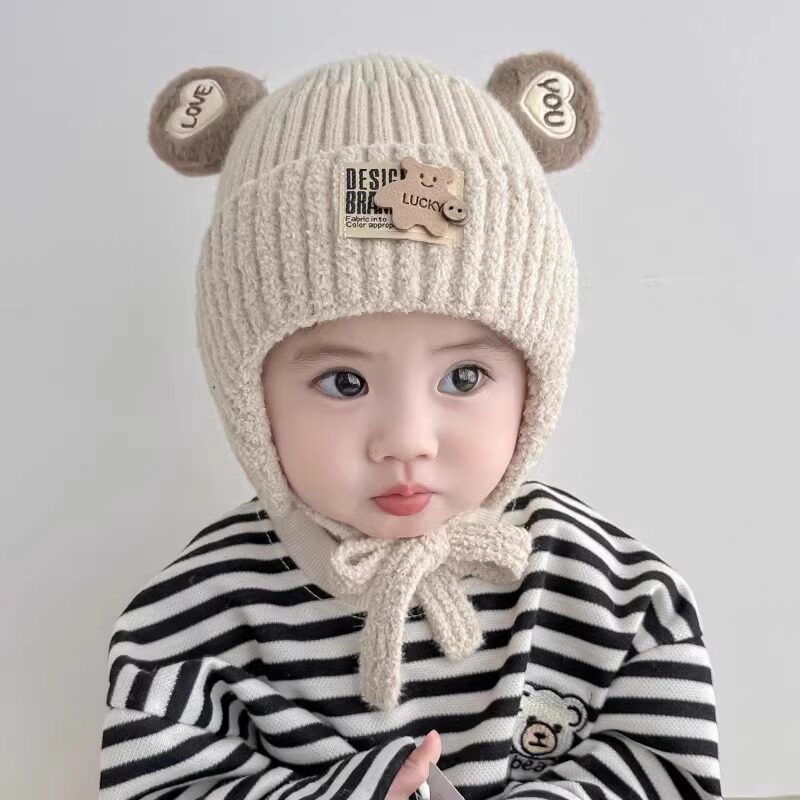 hugz儿童帽子男孩女孩保暖针织毛线帽秋冬季户外护耳防风熊仔帽子