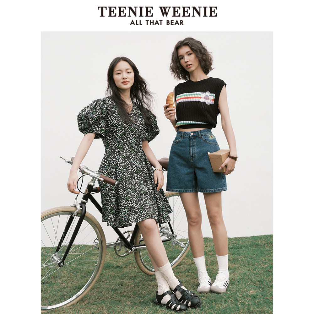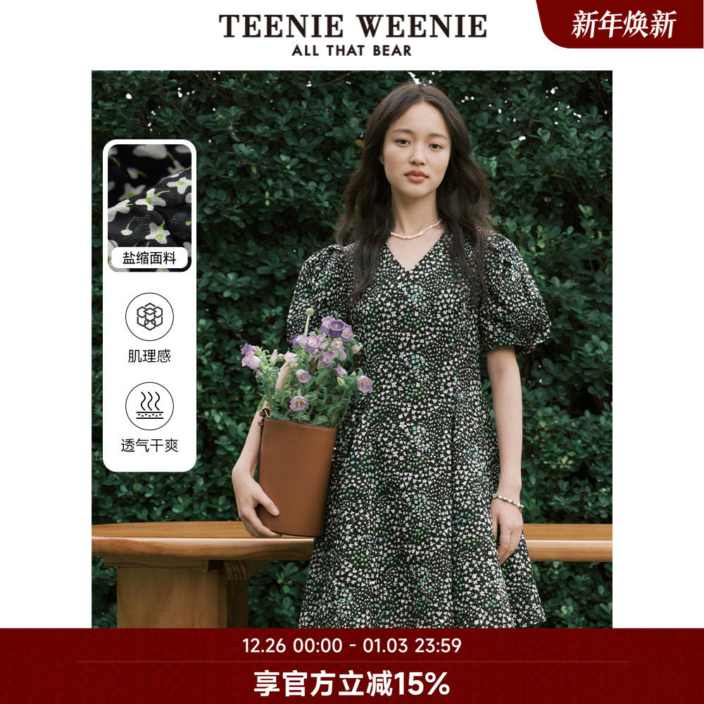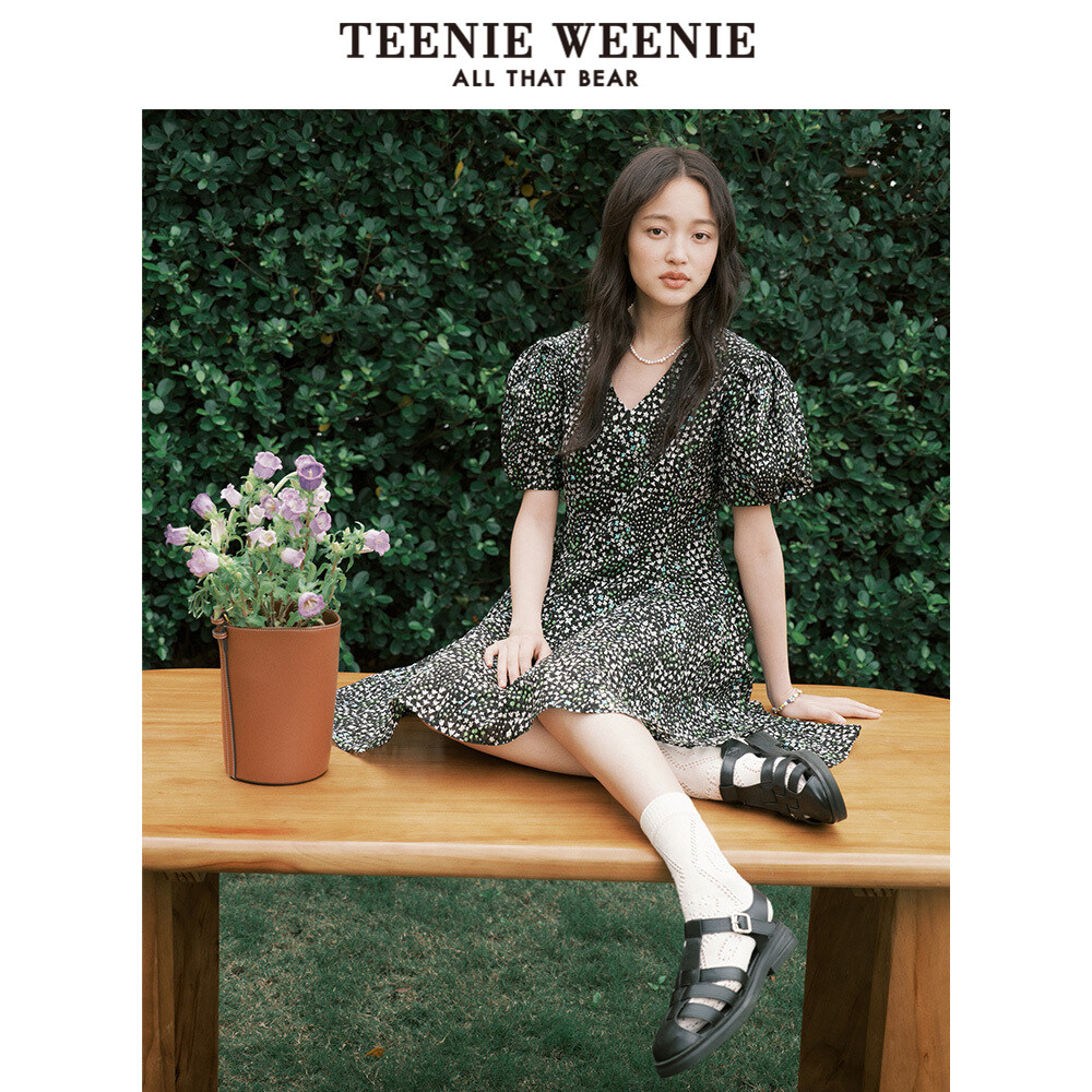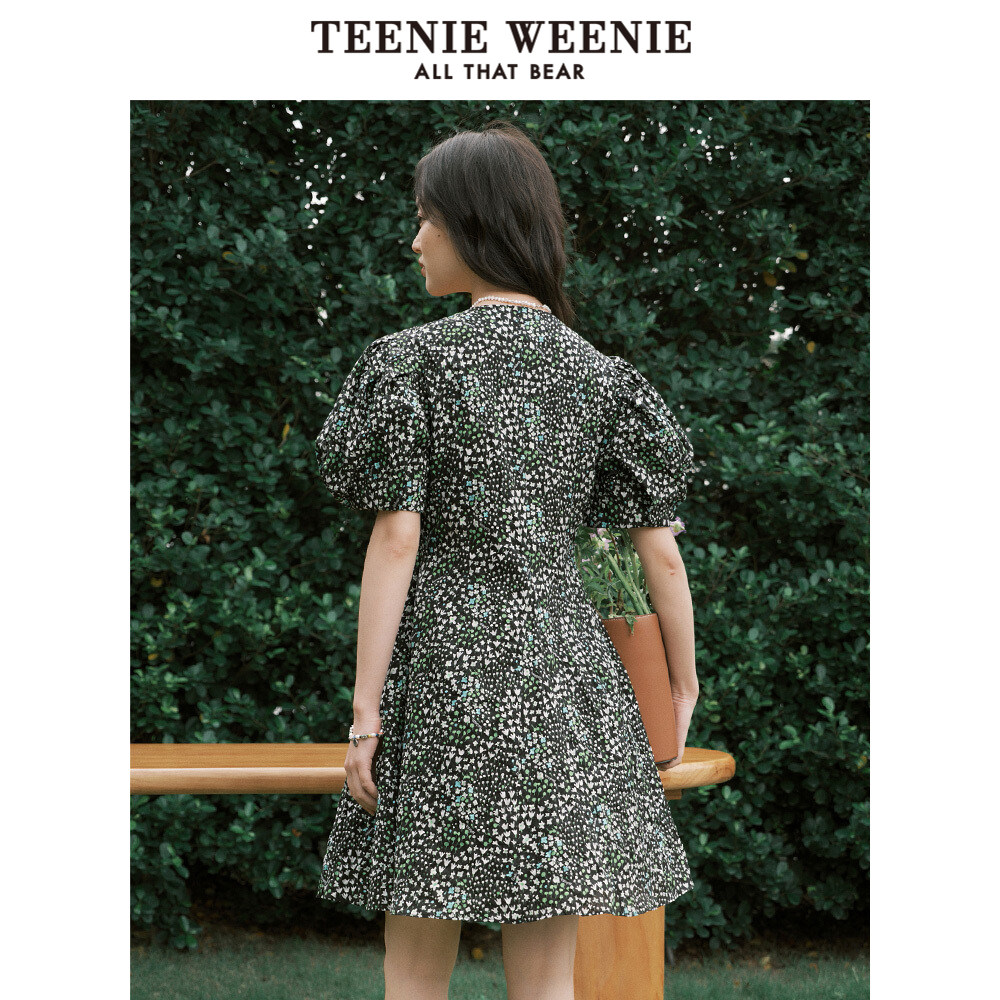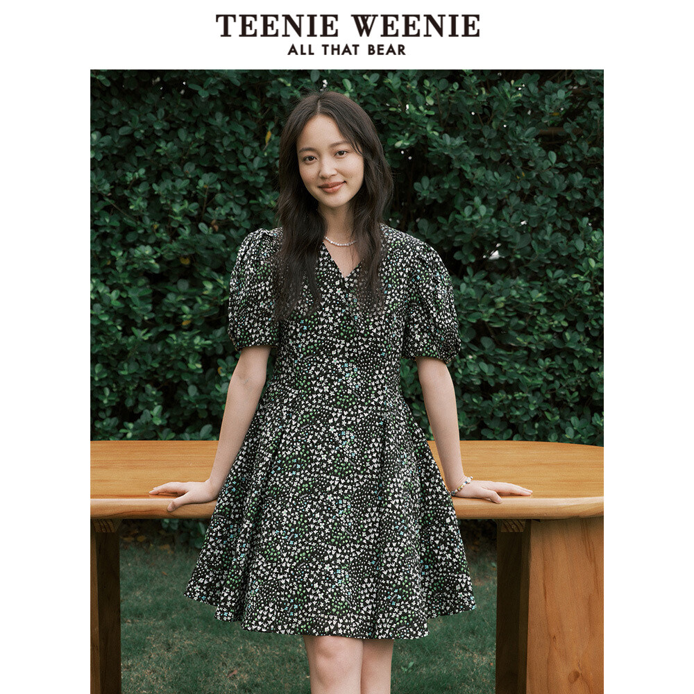 TeenieWeenie小熊奥莱V领满身印花连衣裙短裙子收腰A字裙淑女裙