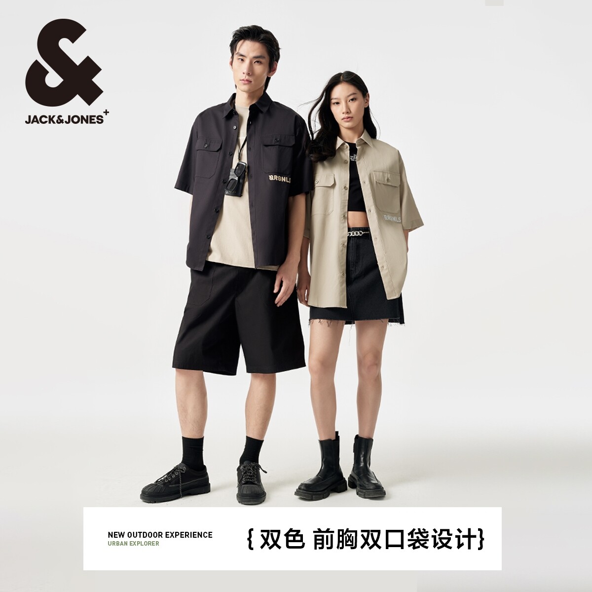 杰克琼斯奥特莱斯夏季新款休闲情侣款工装风衬衣宽松短袖衬衫男装