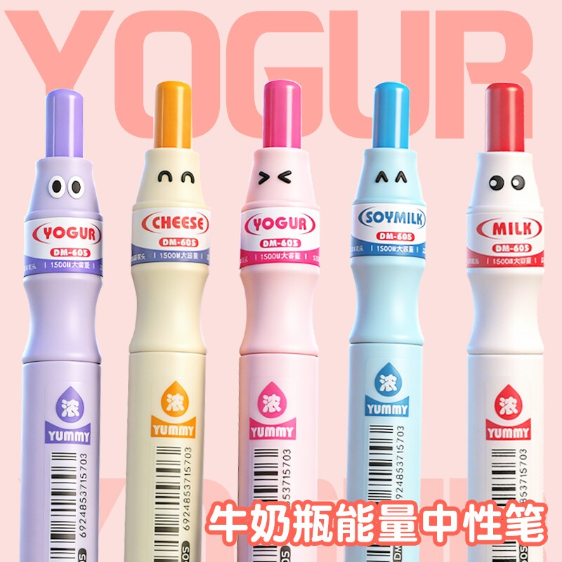 东米中性笔能量牛奶瓶新品605按动高颜值可爱大容量刷题黑笔笔学生用创意防滑纹护套软握浓黑顺滑速干双珠