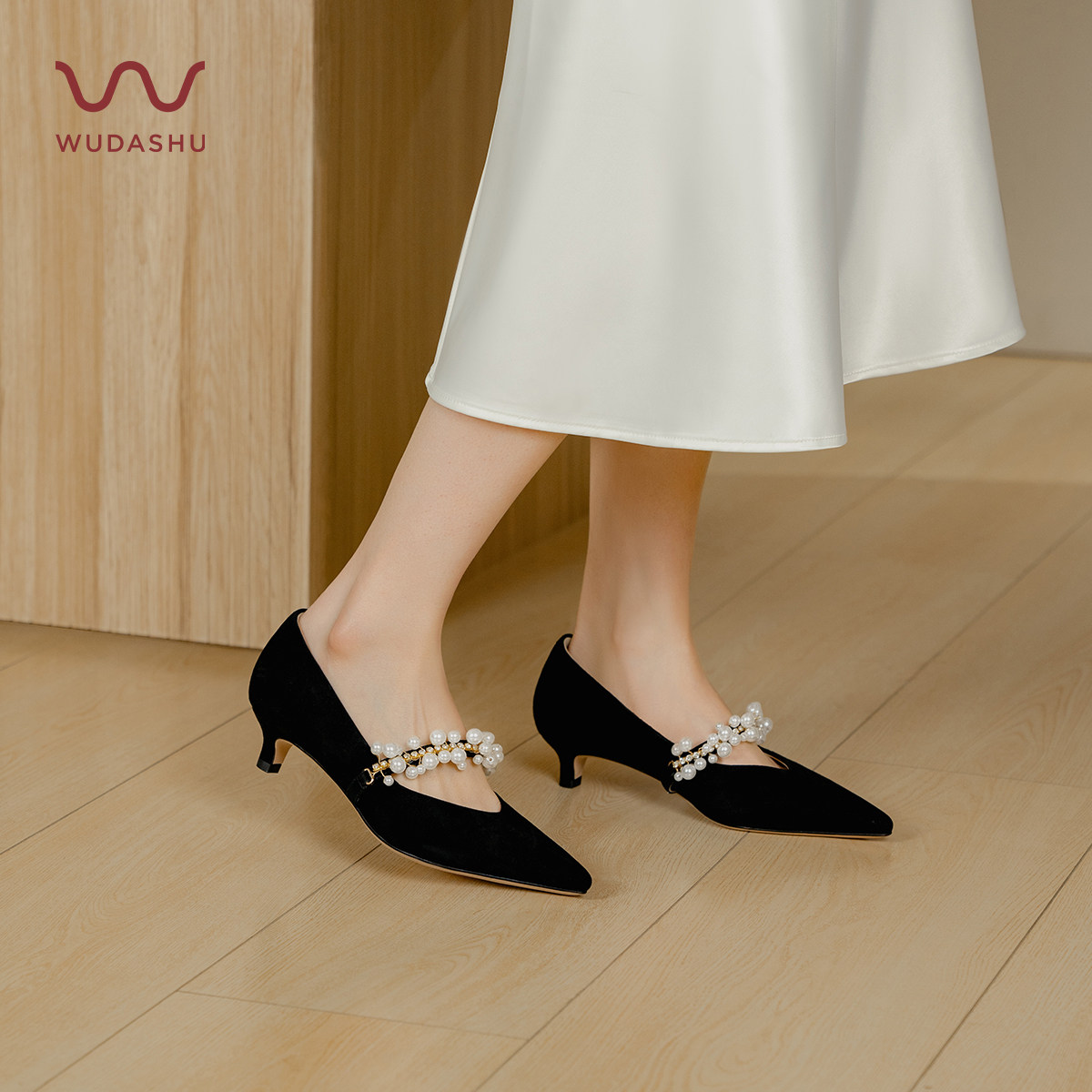 吴大叔2025秋冬气质通勤尖头高跟鞋绒面细跟女鞋时尚浅口珍珠单鞋