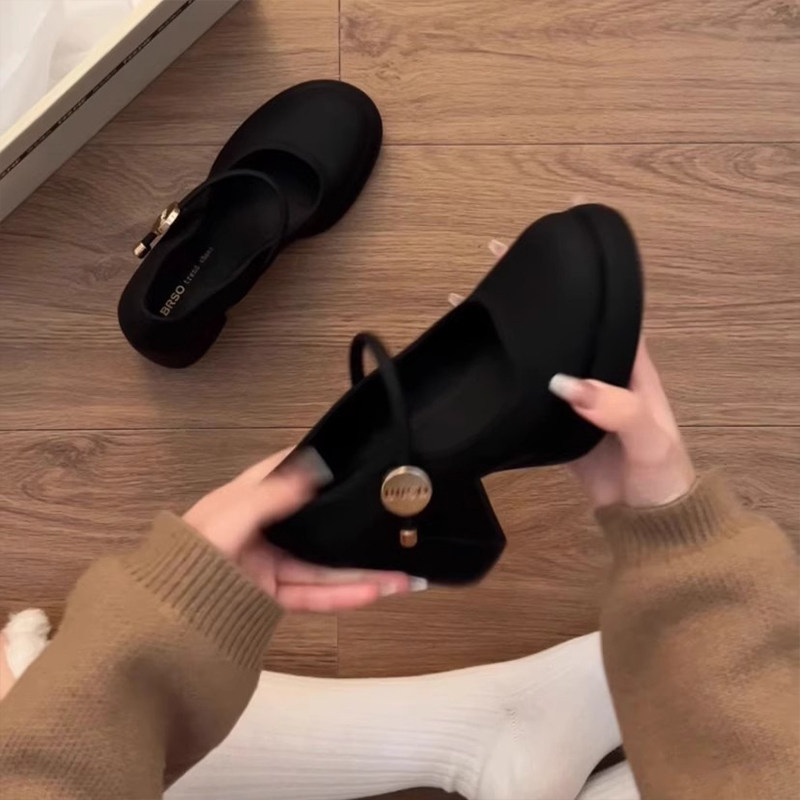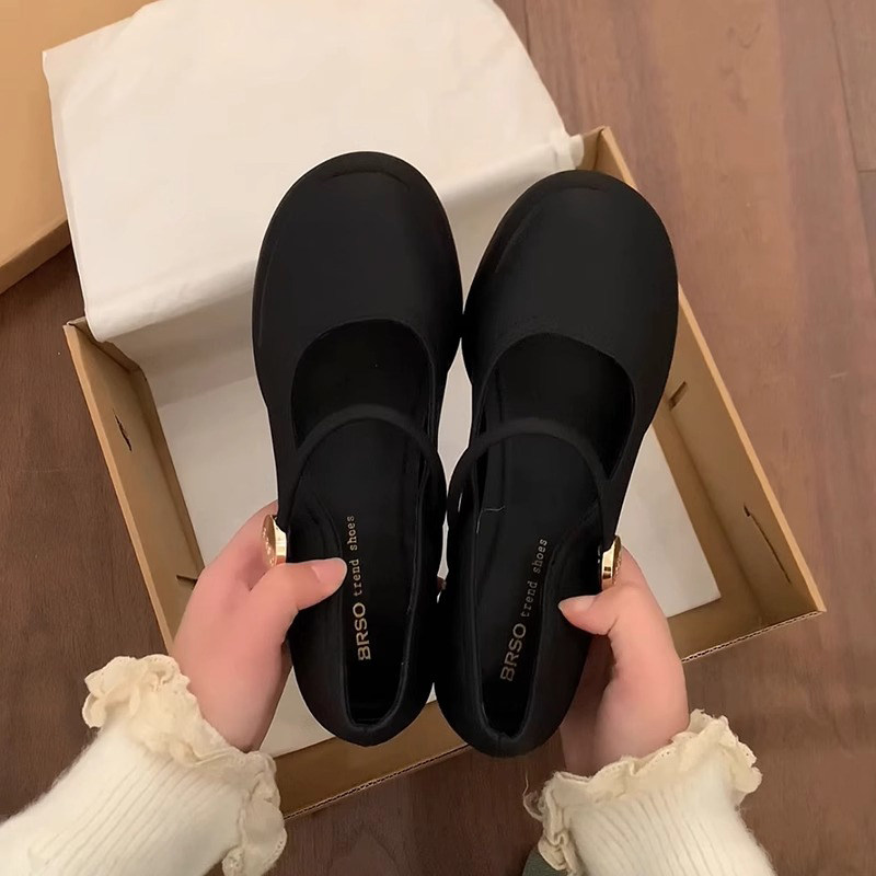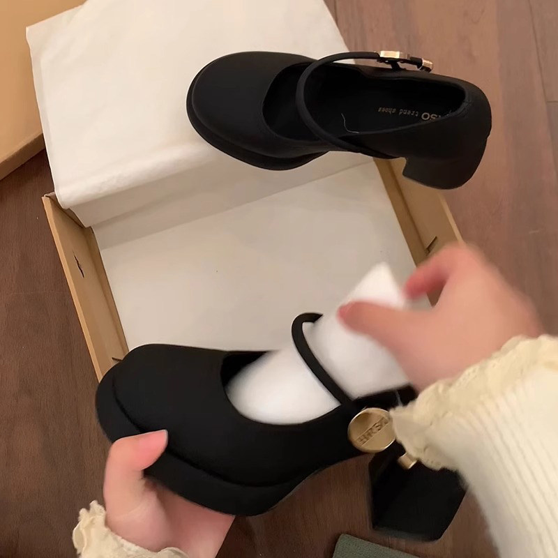 真皮~骄屿复古浅口高跟鞋山茶花一字扣粗跟单鞋尖头气质玛丽珍鞋