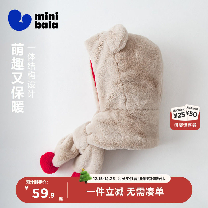 迷你巴拉巴拉儿童帽子男女宝宝毛绒保暖围巾一体帽冬季护耳套头帽