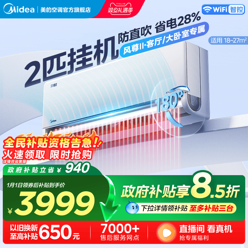 美的风尊二代空调小2匹大挂一级变频冷暖卧室家用官方正品挂机