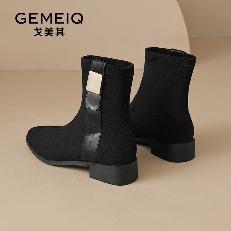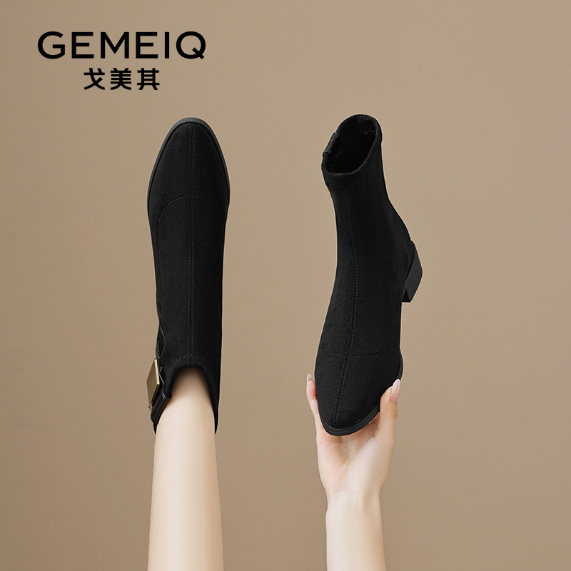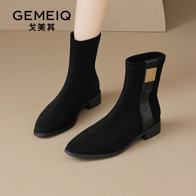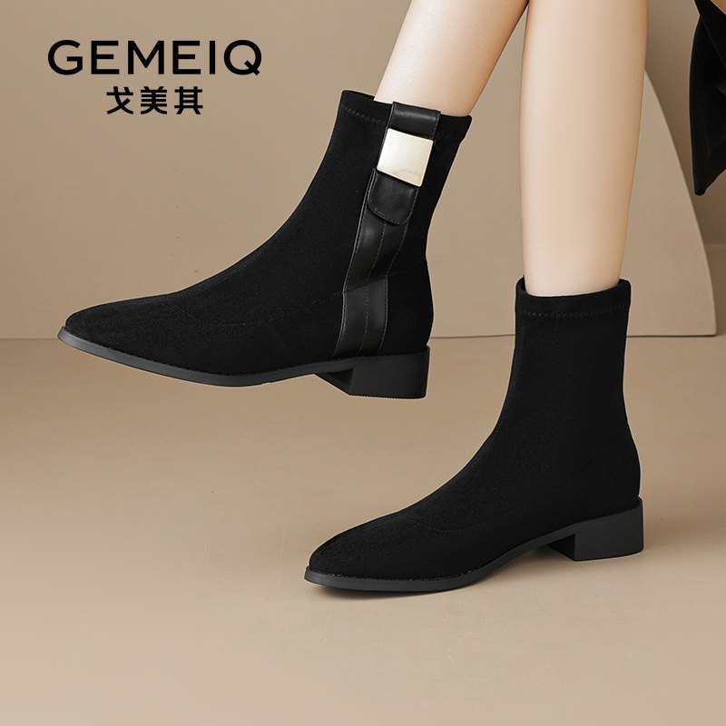 戈美其靴子短靴女款舒适新款春秋单靴粗跟显瘦尖头绒面针织瘦瘦靴