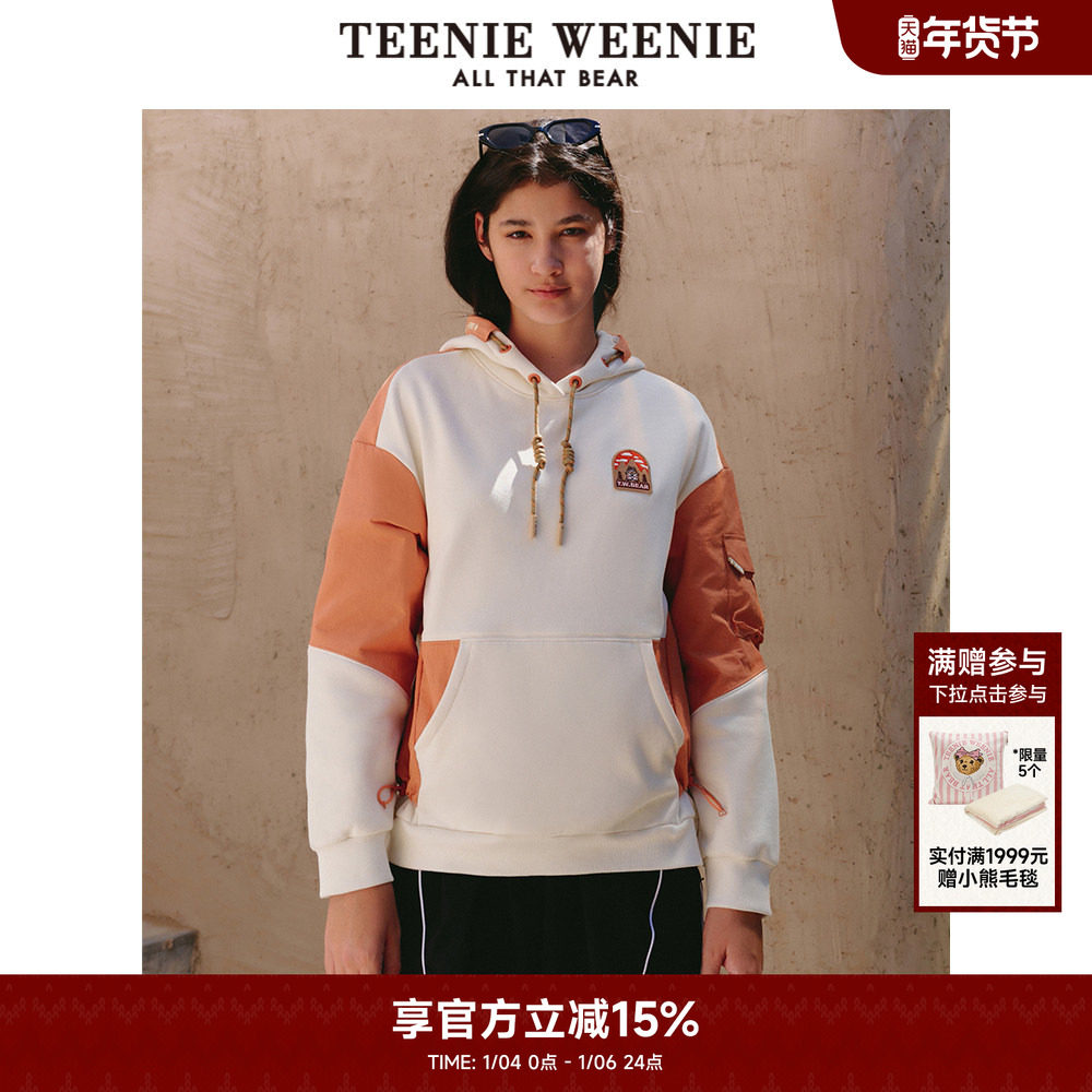 TeenieWeenie小熊奥莱春季季撞色连帽套头加绒加厚保暖卫衣宽松女