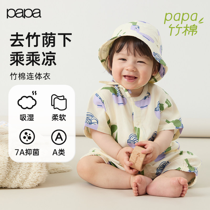 【竹棉】papa爬爬夏季婴儿短袖爬服男女宝宝纱布连体衣抑菌透气