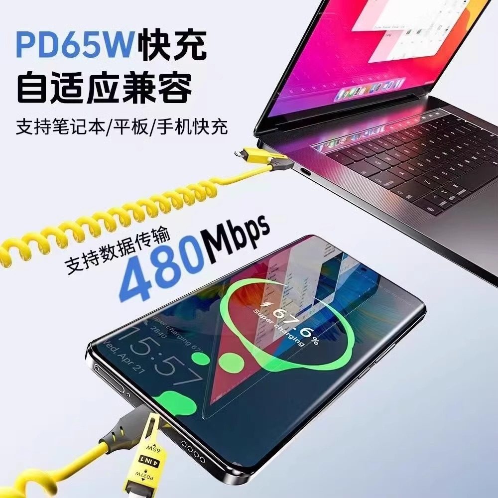 弹簧伸缩四合一65w适用苹果华为小米oppovivo多功能iphone16数据线carplay车载数据传输文件