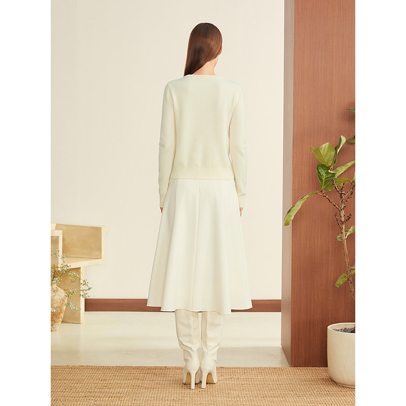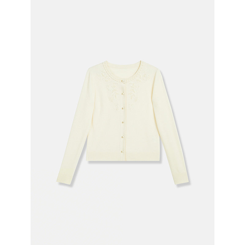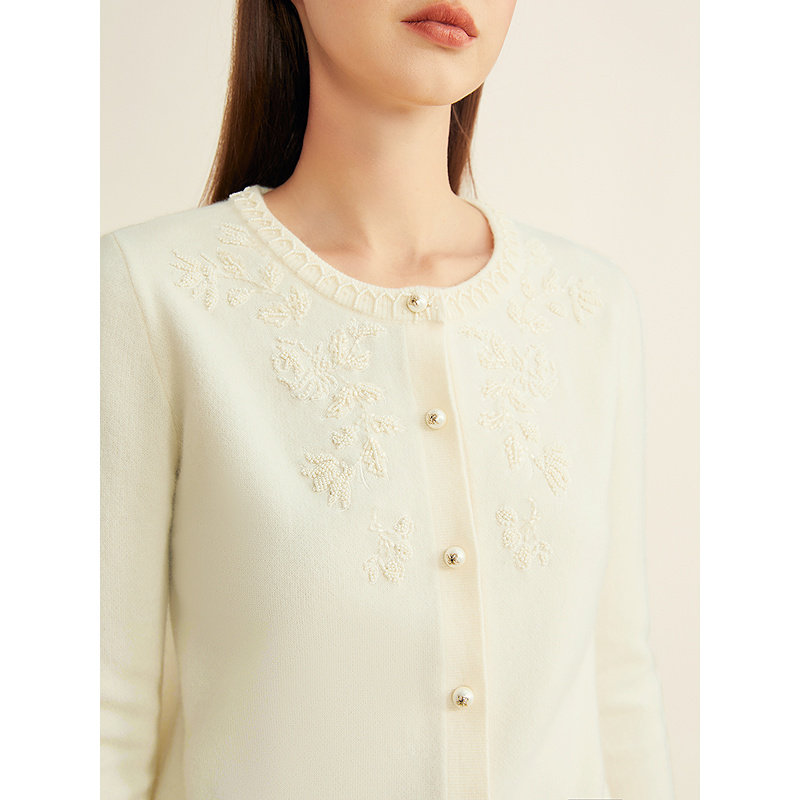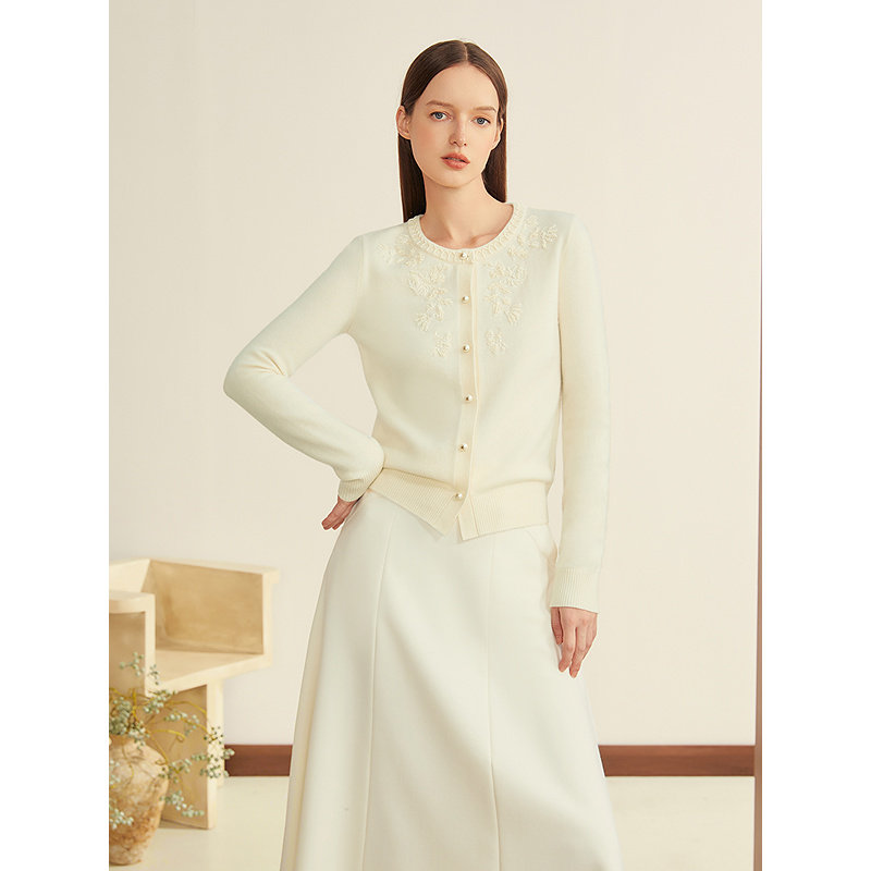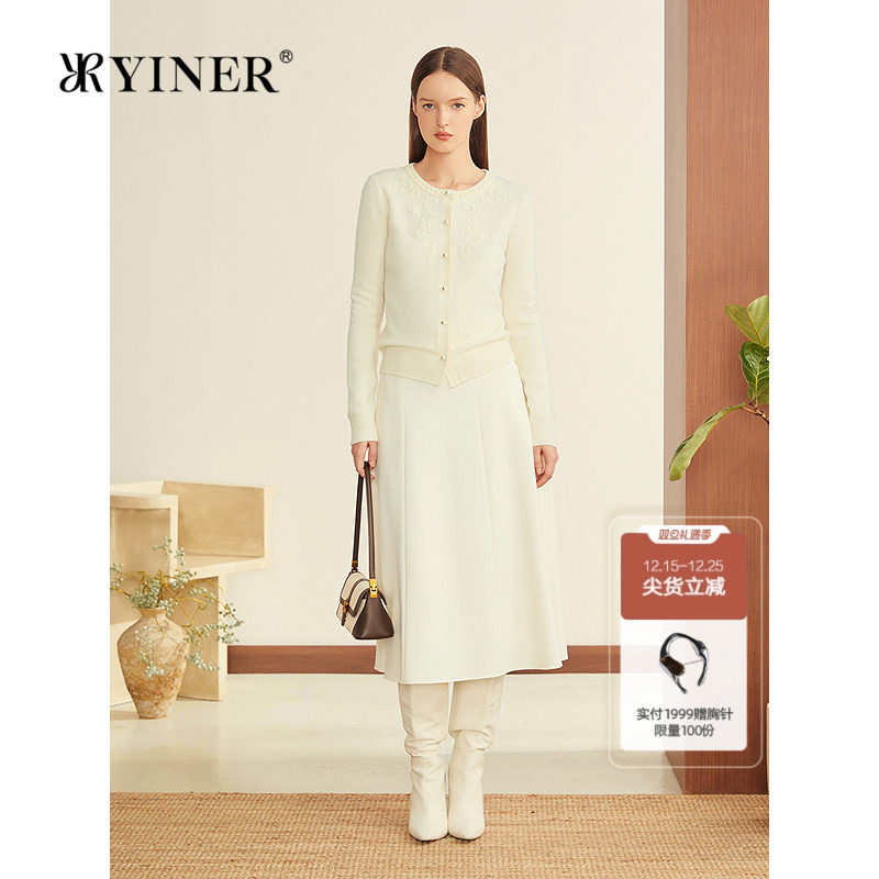 YINER音儿2025冬季新款米白色羊毛羊绒混纺海鸥领绣线订珠针织衫