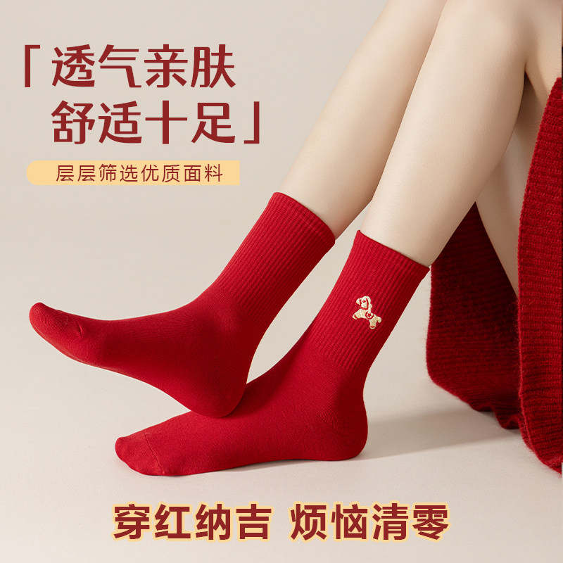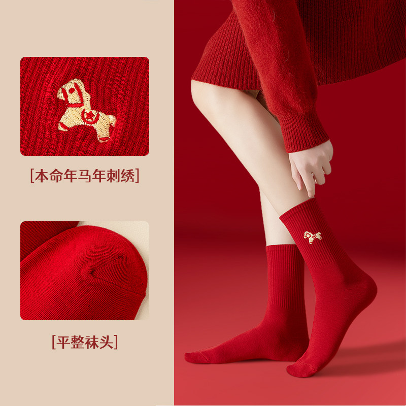 本命年红袜子男女同款秋冬中筒袜新疆棉马年2026刺绣情侣新年长袜