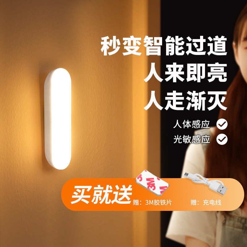 人体感应小夜灯智能充电式声控灯家用无线过道墙壁起夜楼道感应灯