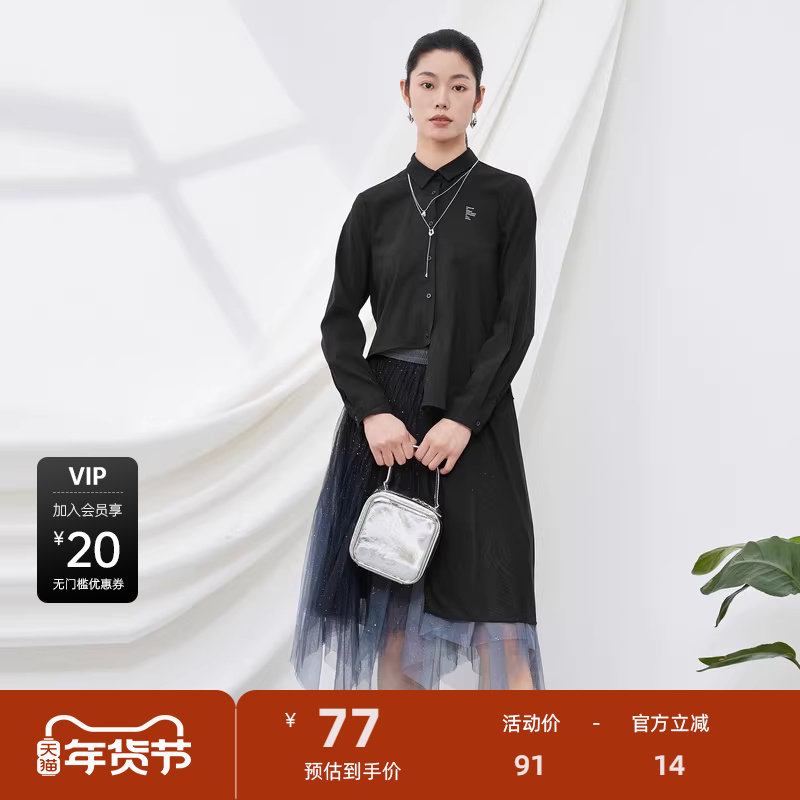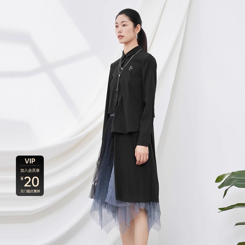 【秒杀】S·DEER圣迪奥女装秋翻领网纱拼接字母长款衬衫S201Z0508