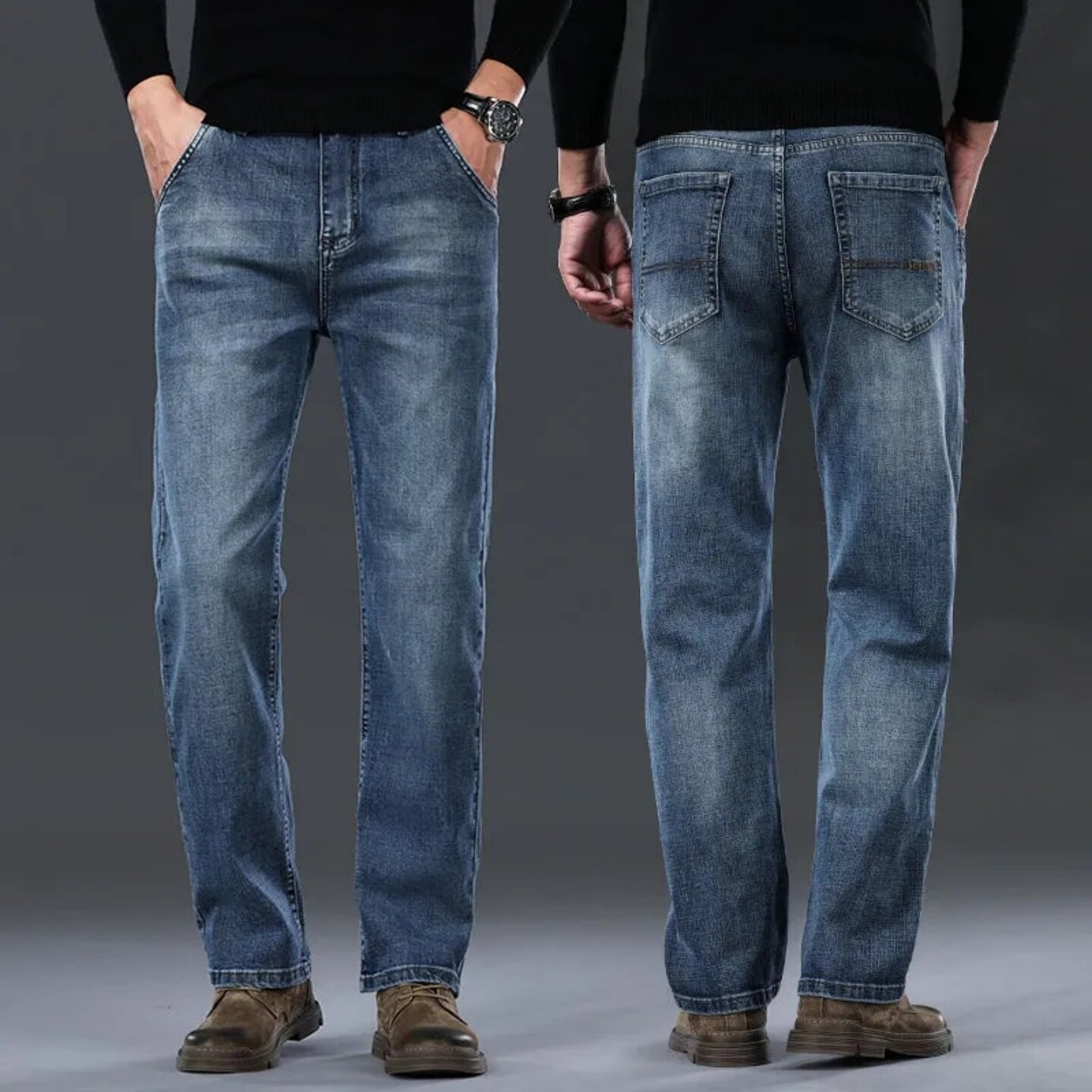 弹力牛仔裤男款冬季保暖直筒宽松春秋商务休闲长裤男士耐磨工作裤
