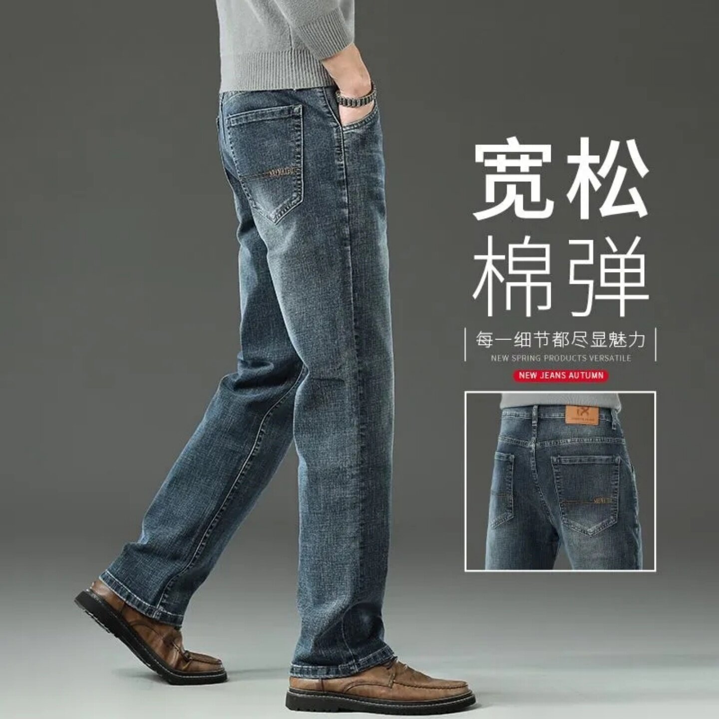 吉普专柜秋冬季新款复古牛仔裤男宽松直筒大码加绒加厚水洗长裤子