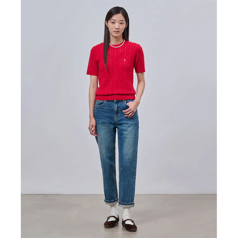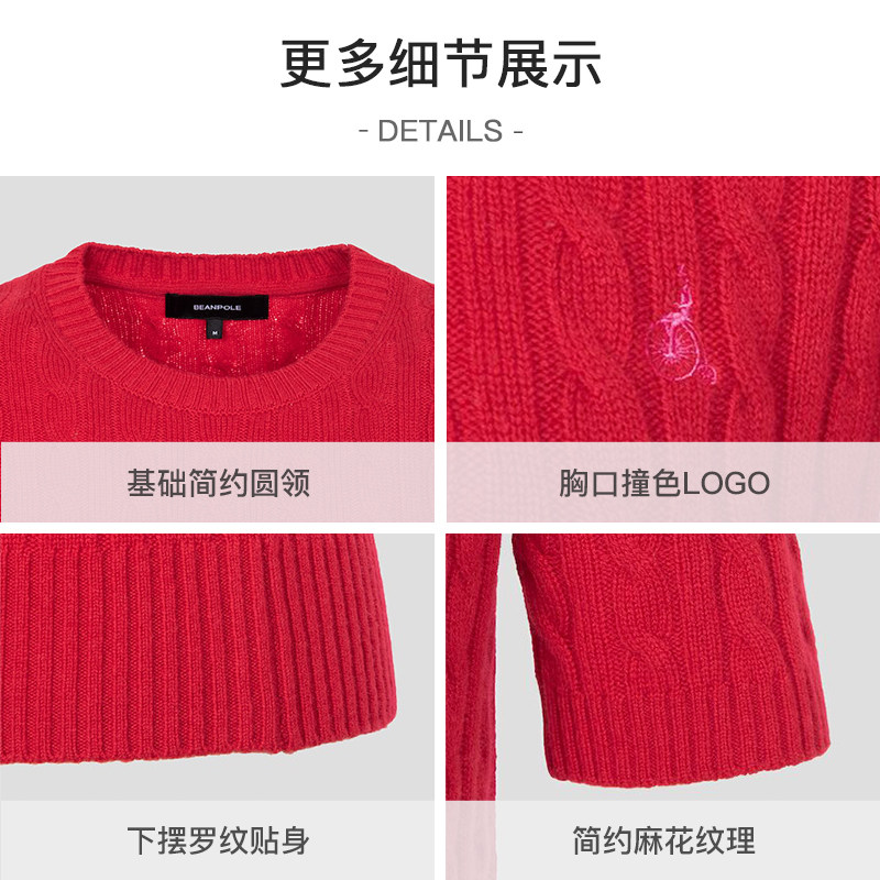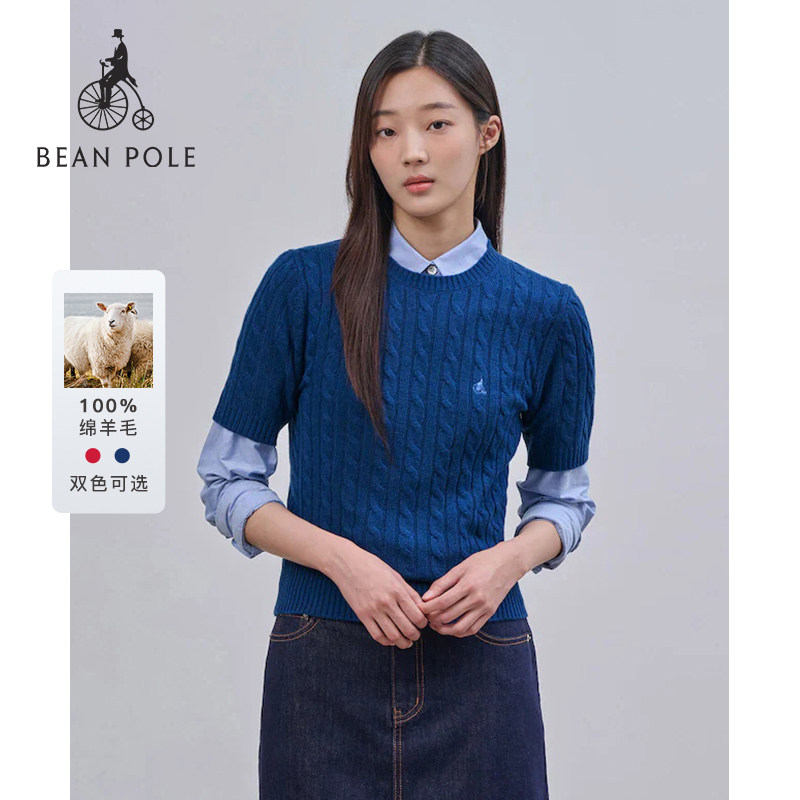 100%绵羊毛 BEANPOLE滨波 女圆领甜美风美拉蓝红色毛衣短袖针织衫