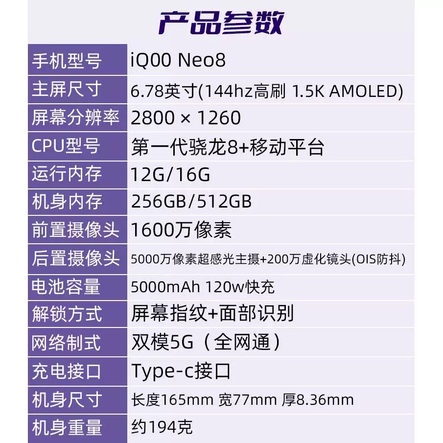 IQOO NEO8 骁龙8+ Gen1处理器120瓦超级快充5G旗舰工作游戏手机