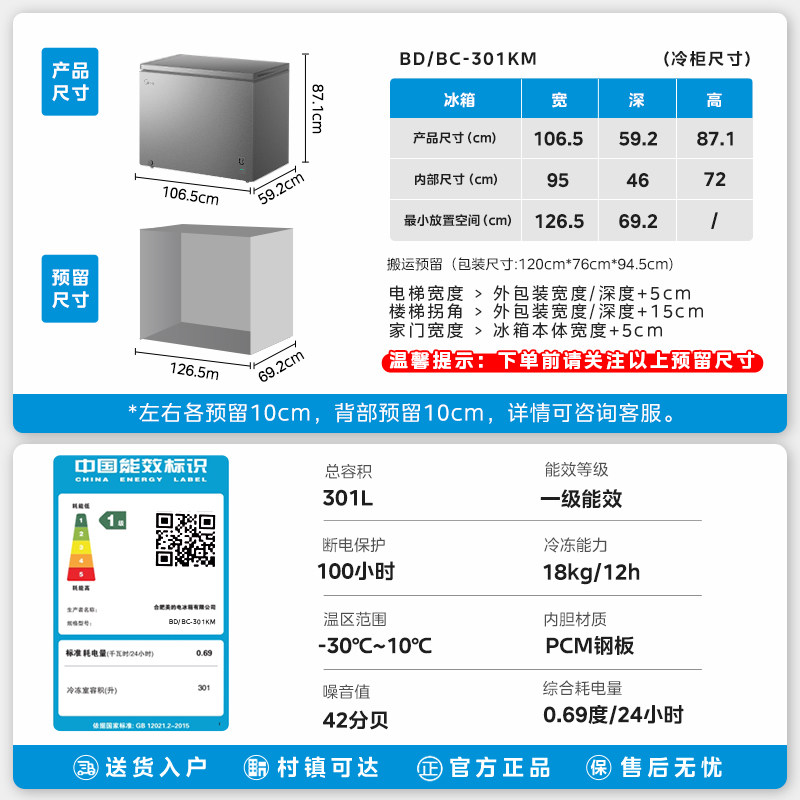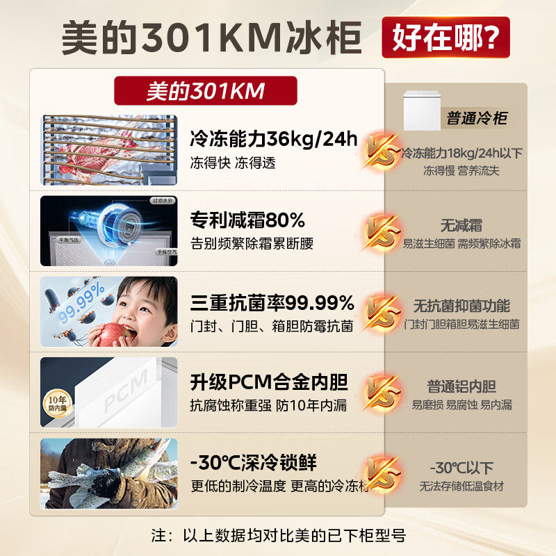 美的301L冰柜大容量家用冷藏冷冻两用冷柜一级节能减霜商用冷冻柜