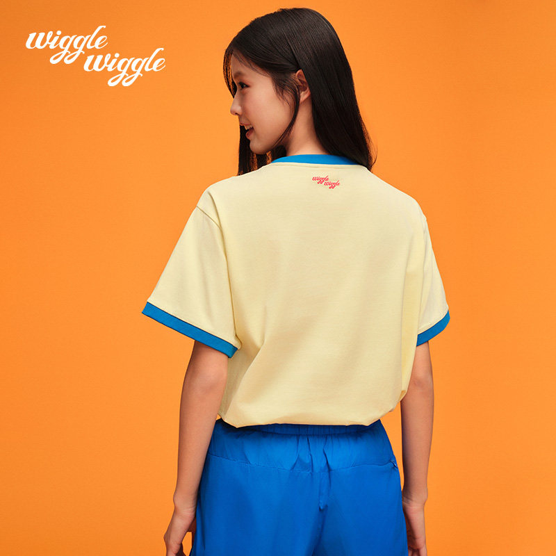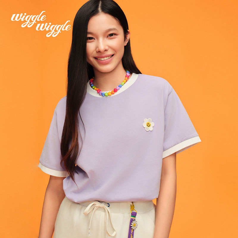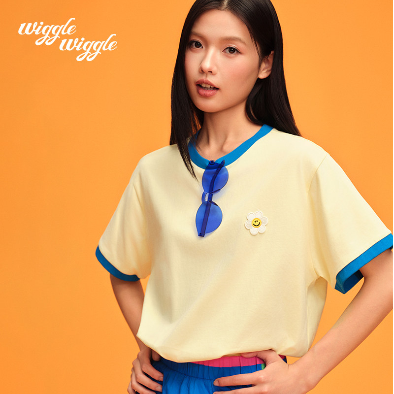 wigglewiggle25年夏季韩笑脸花凉感条纹撞色短袖T恤男女同款上衣