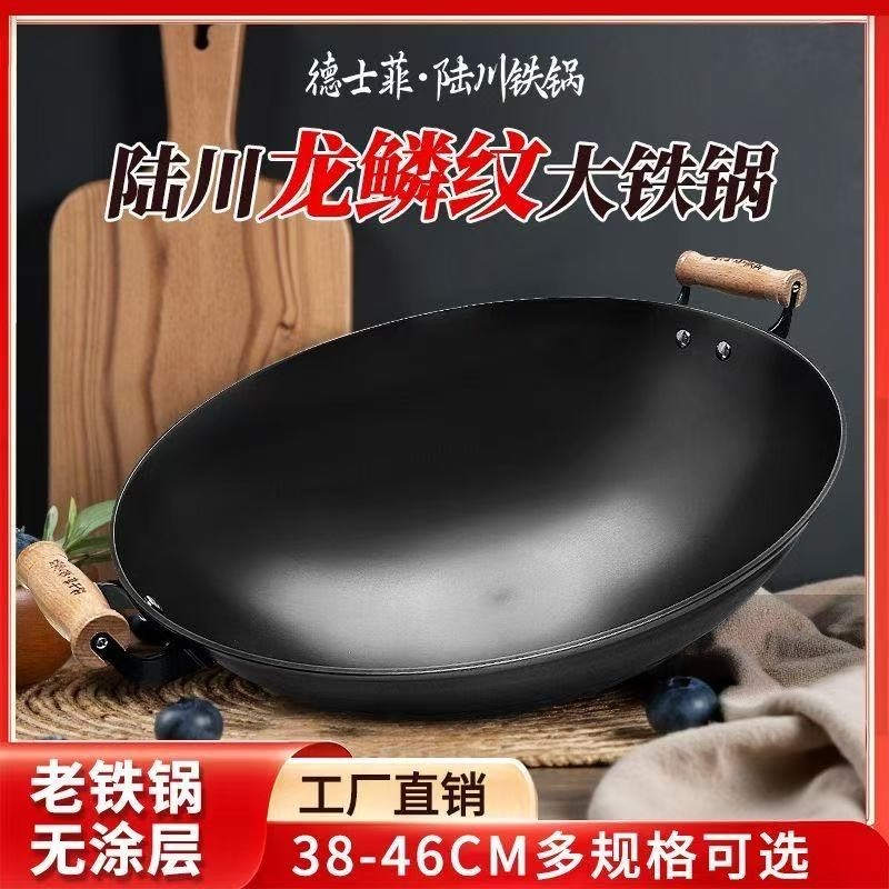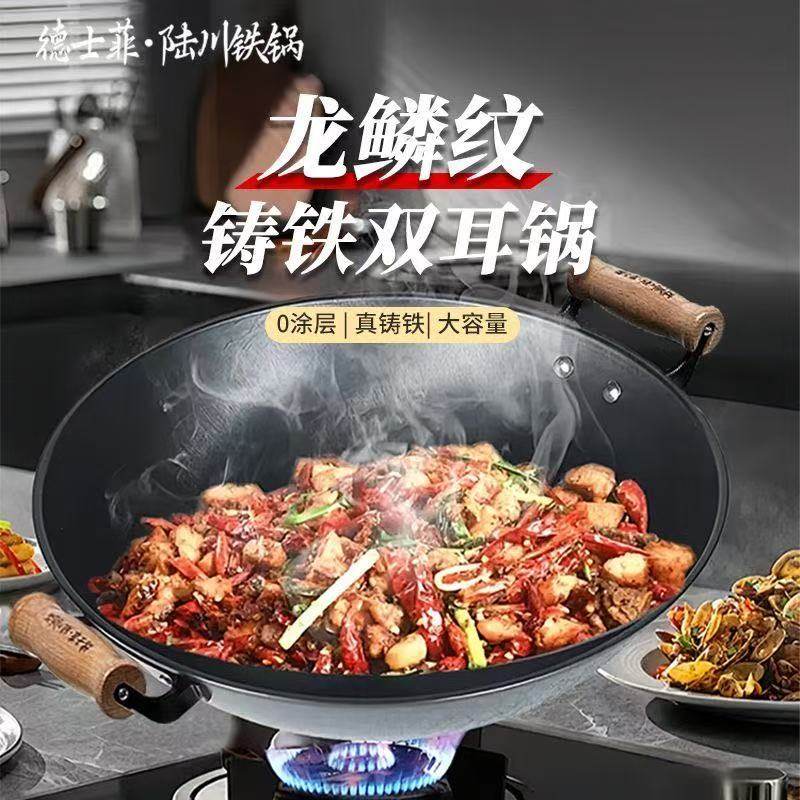 龙鳞无涂层不粘双耳圆底铸铁炒锅传统老式铸铁锅家用炒菜锅生铁锅