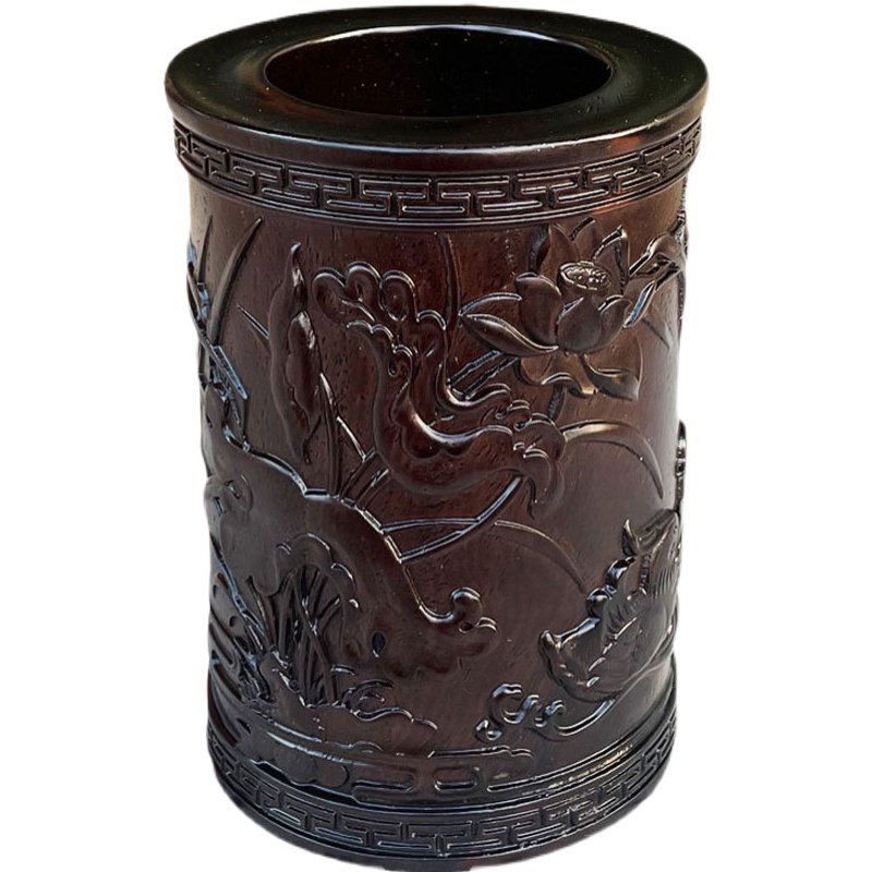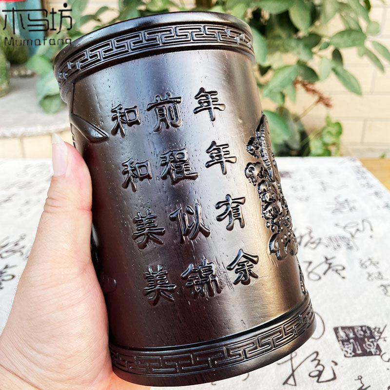 红木雕刻创意笔筒大容量原木复古中国风学生文具收纳盒黑檀木摆件