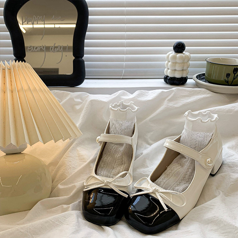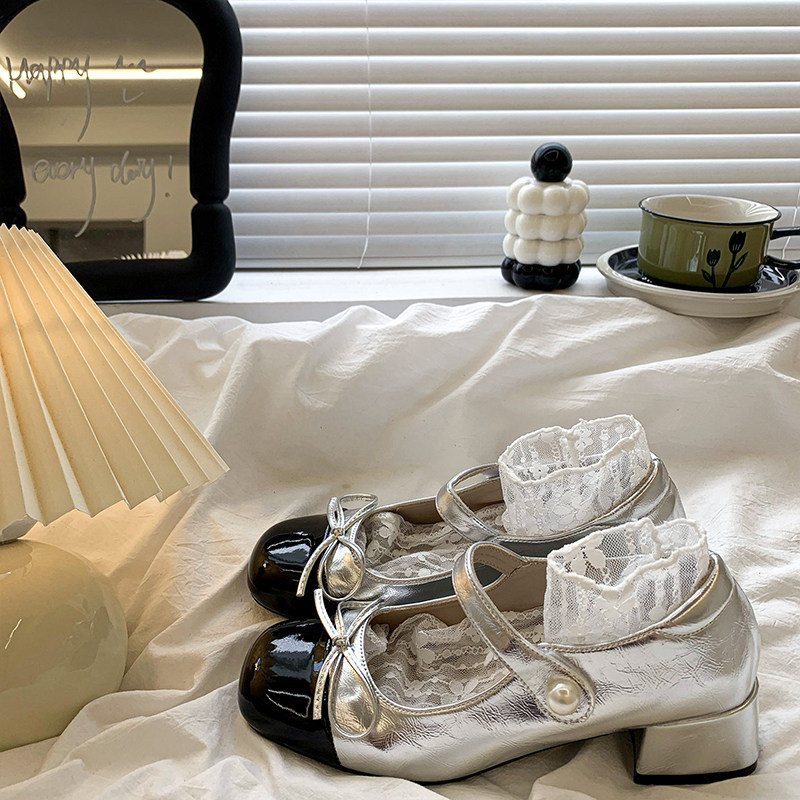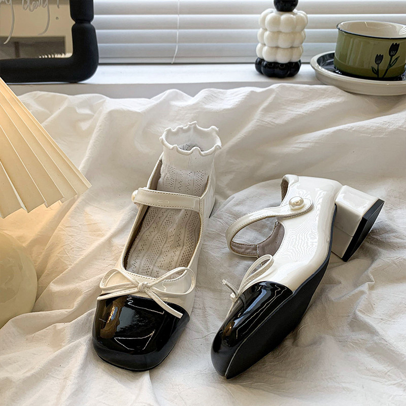 真皮~骄屿法式仙女风高跟鞋女婚鞋玛丽珍鞋珍珠系蝴蝶结粗跟单鞋