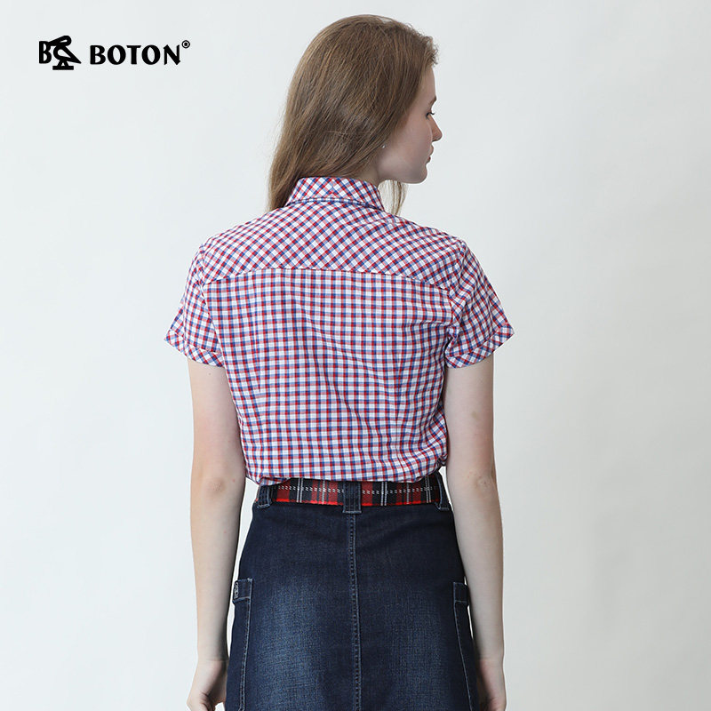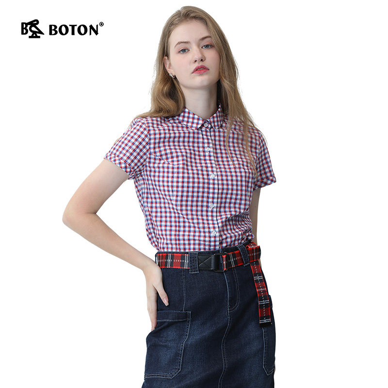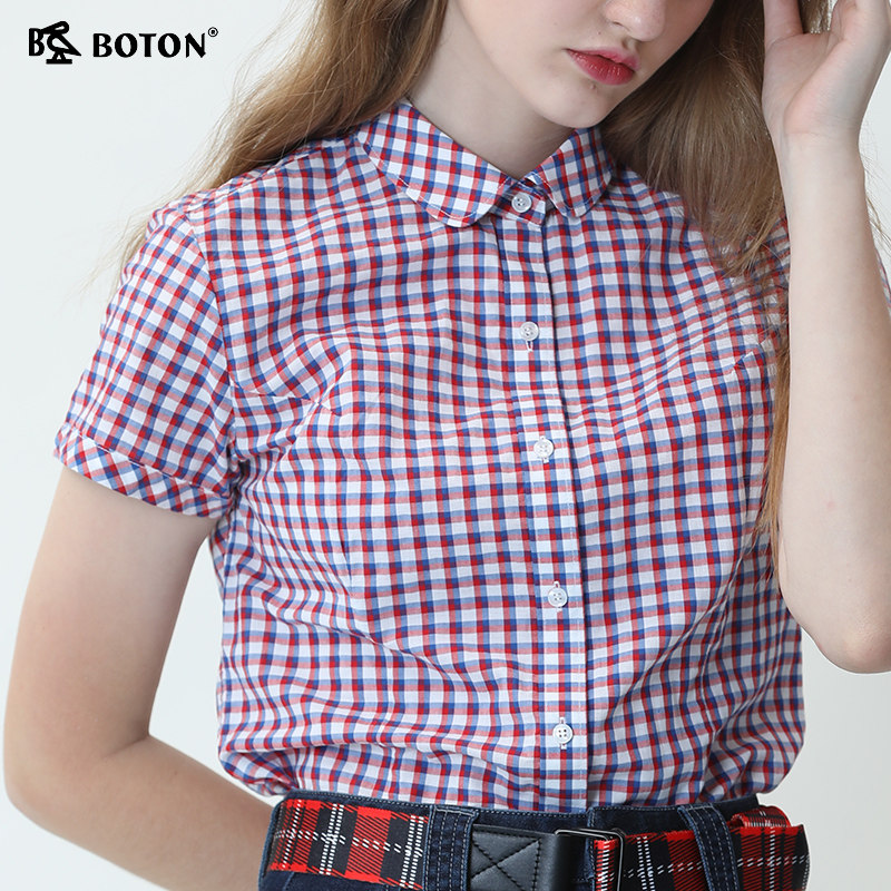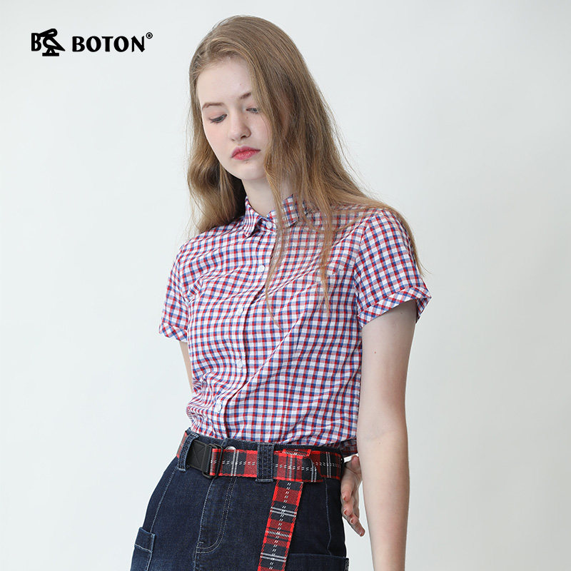 波顿2025夏季短袖透气格子衬衫经典英伦女士休闲透气修身衬衣