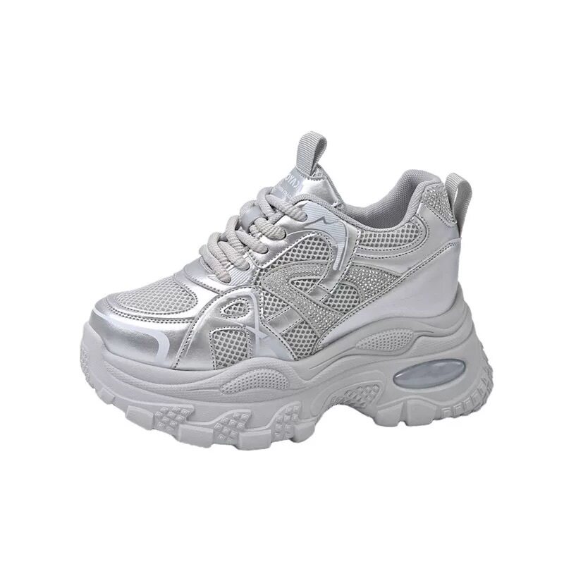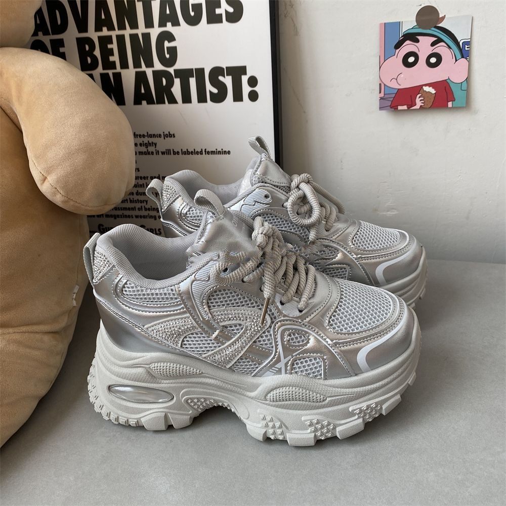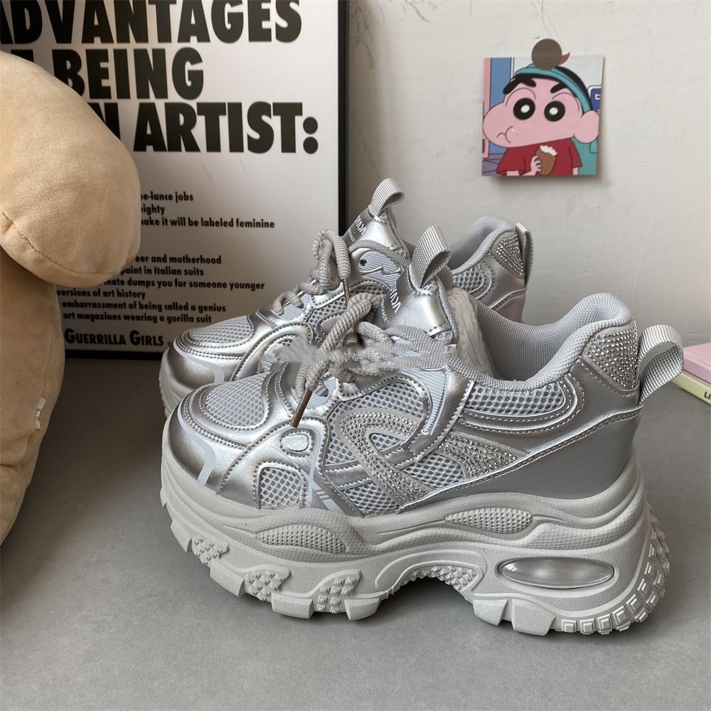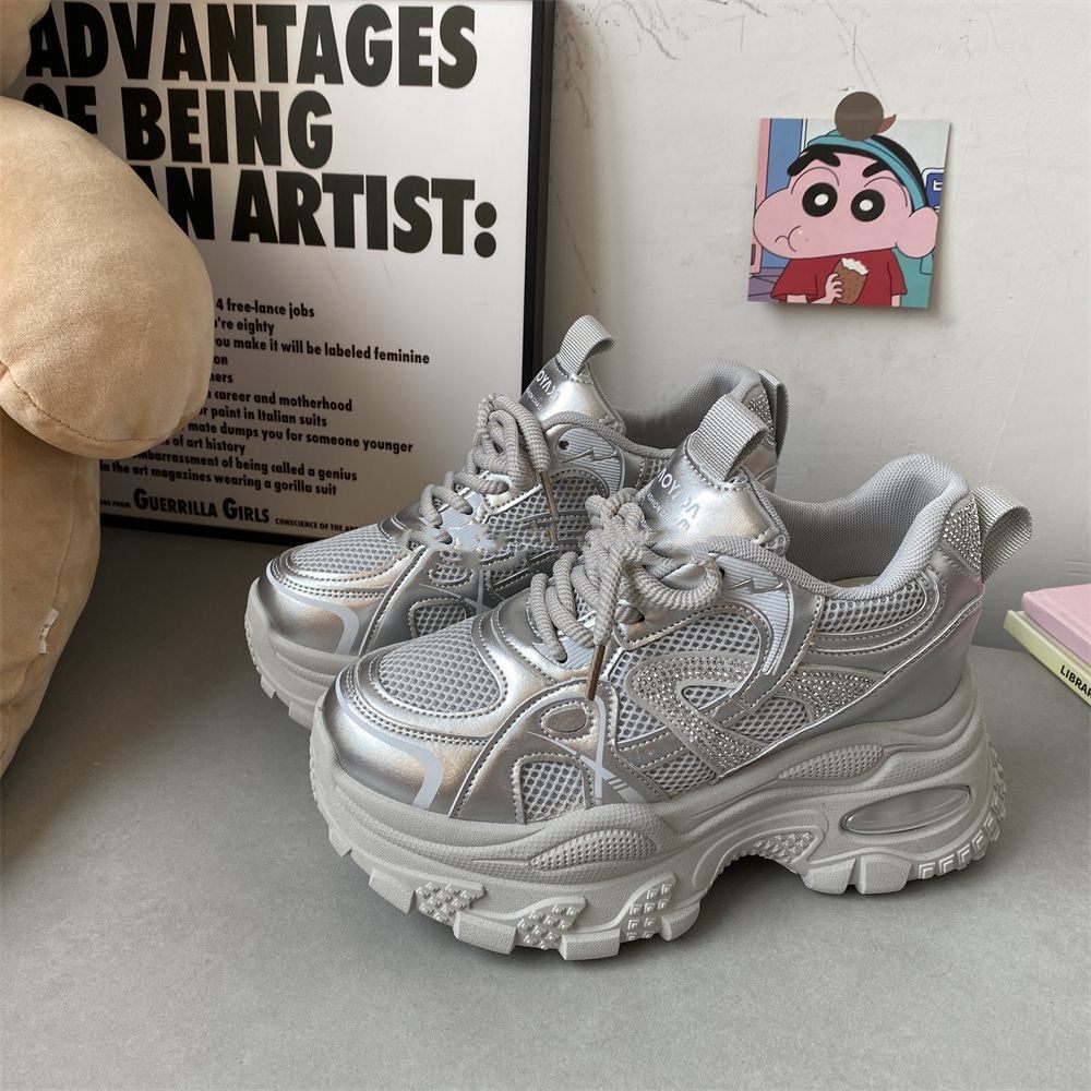 厚底老爹鞋女2025女款新款秋冬保暖加绒女鞋银色内增高休闲运动鞋
