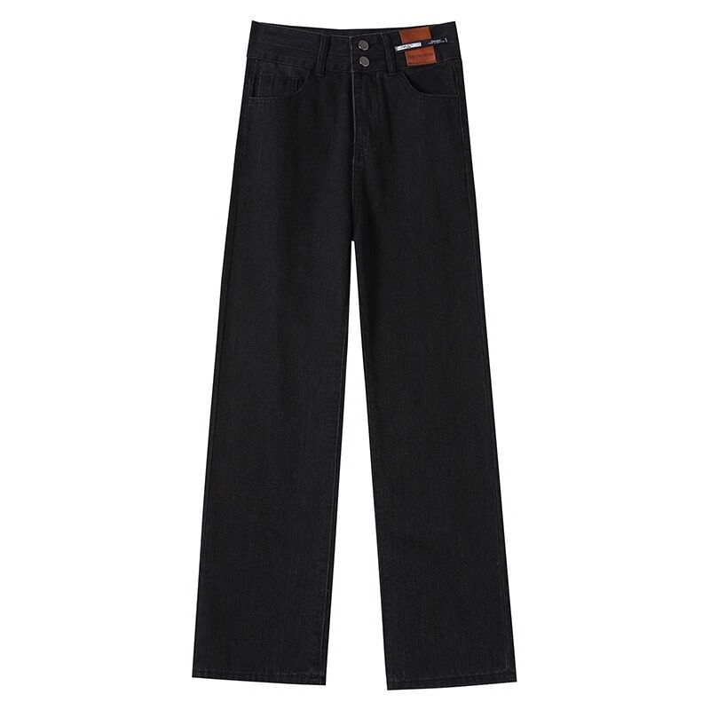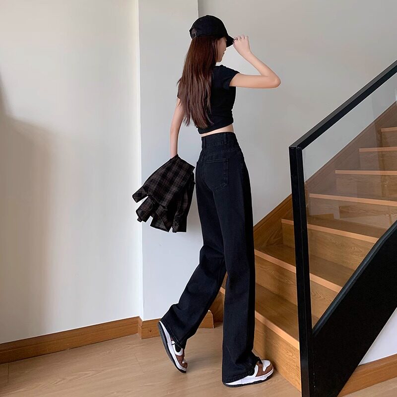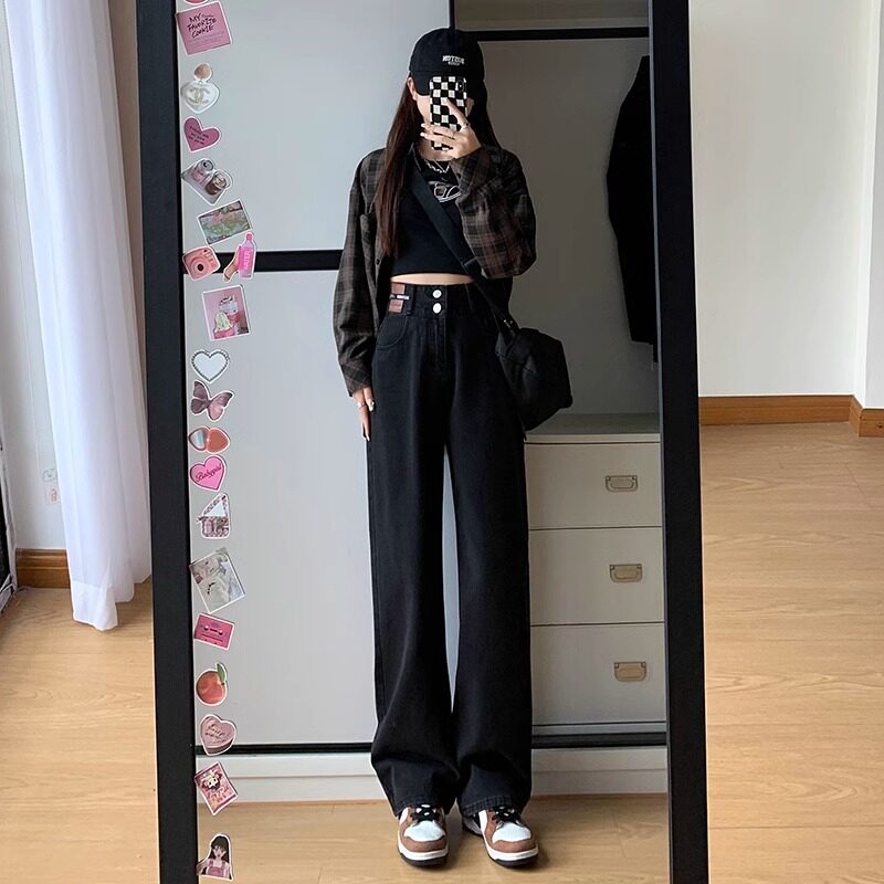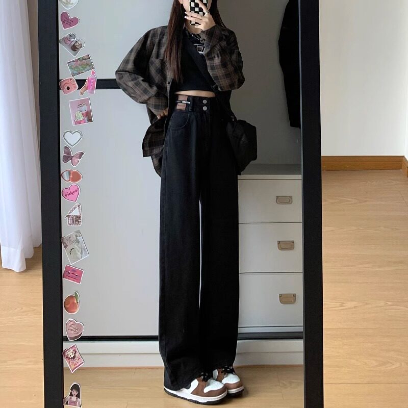 胖mm大码春秋垂感牛仔裤女高腰宽松显瘦直筒百搭窄版休闲阔腿裤子