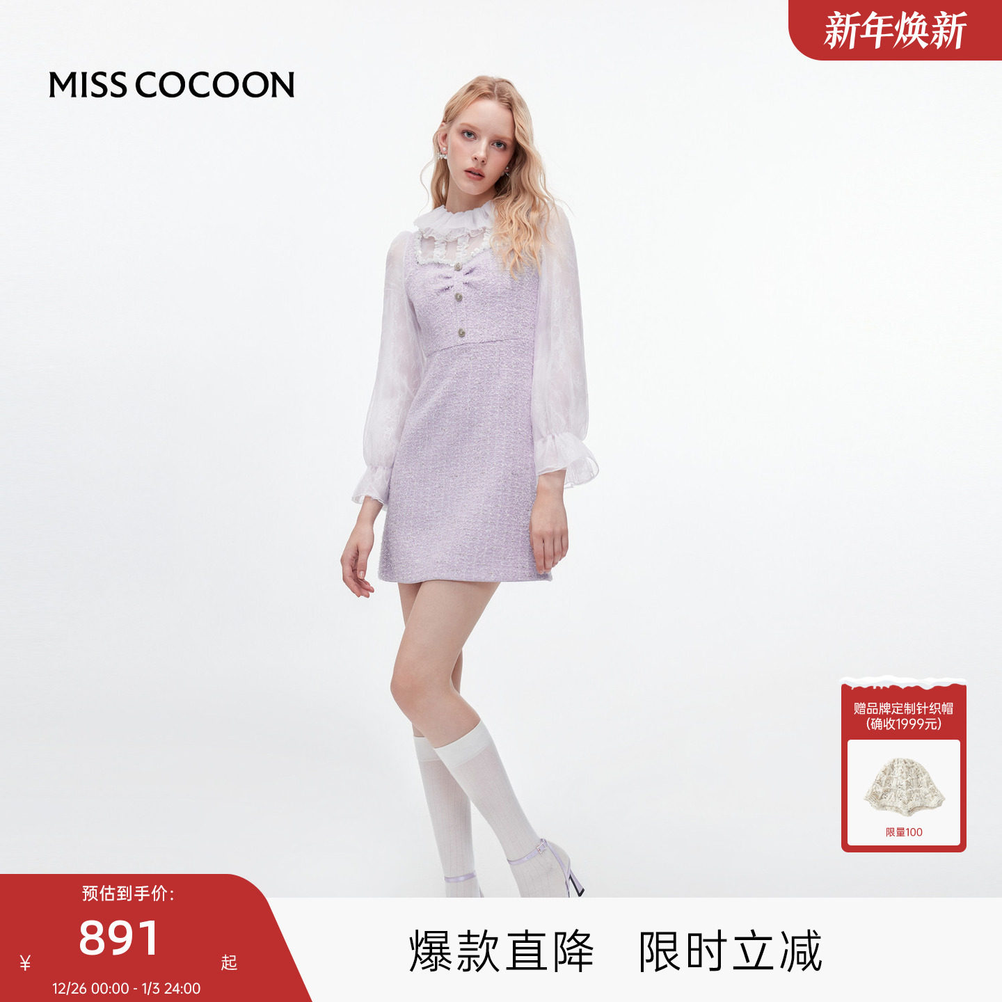 MISSCOCOON可可尼紫色裙子女2025秋冬新款小香风粗花呢拼接连衣裙