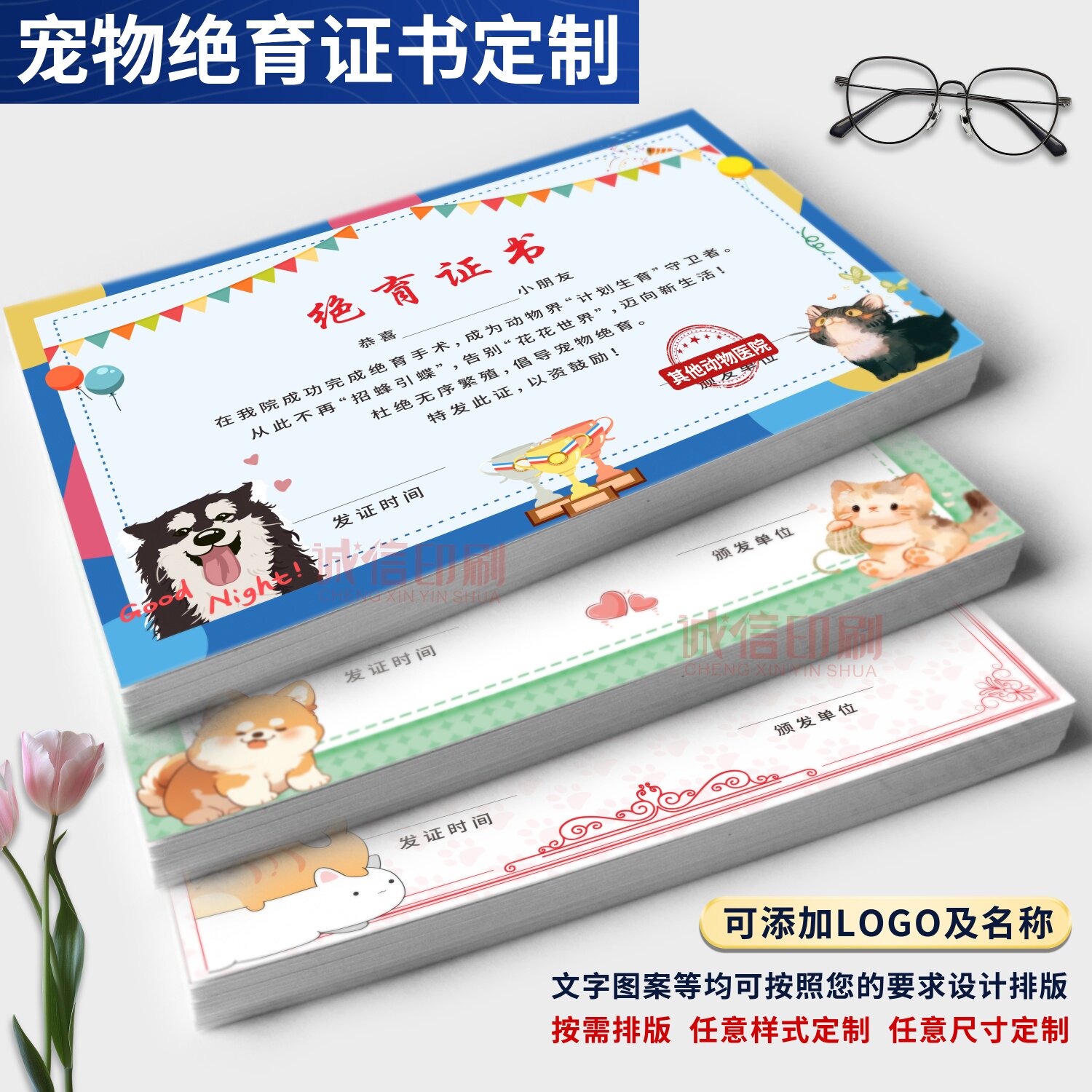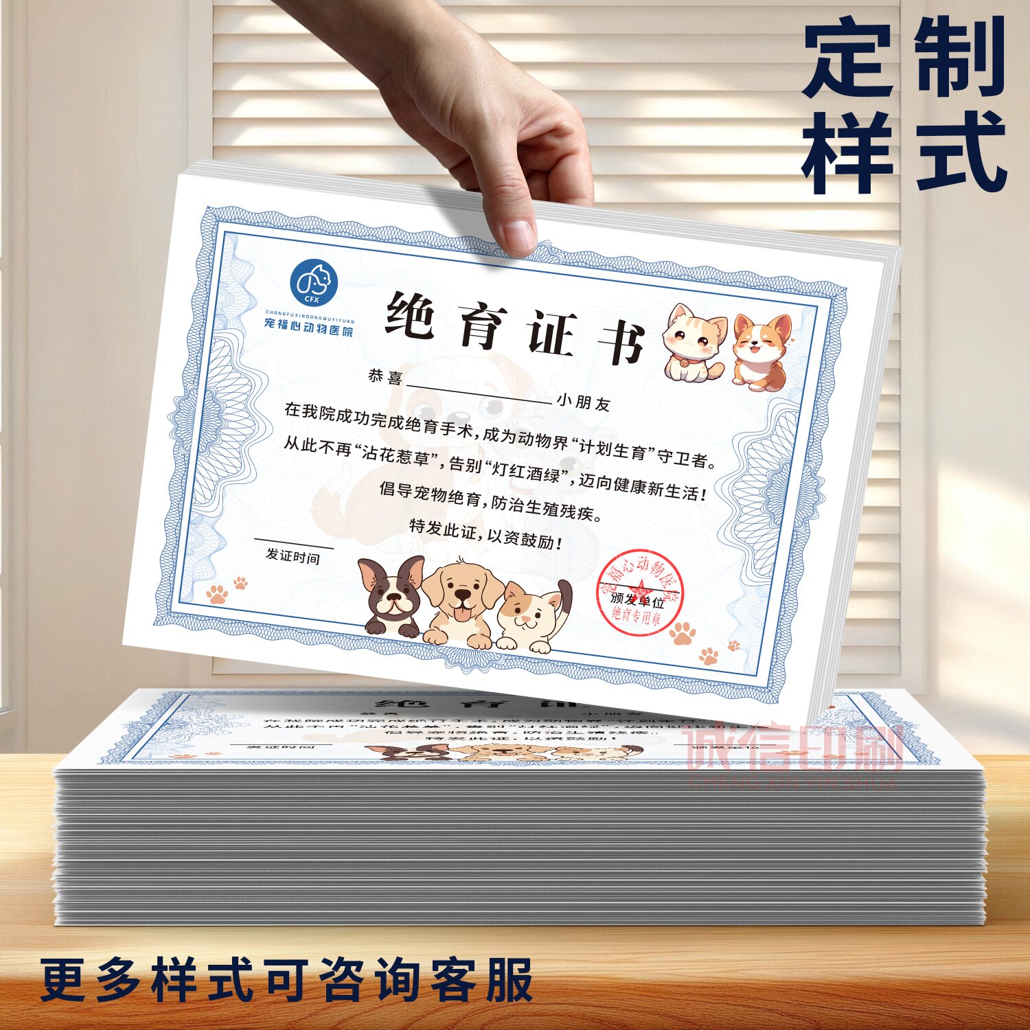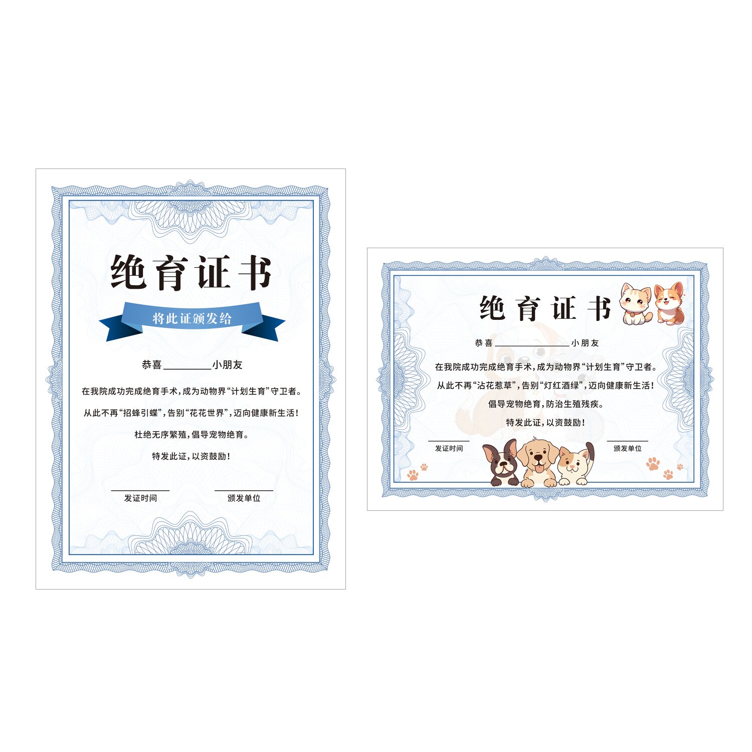 现货宠物绝育证书猫狗绝育光荣证书定制动物计划生育纪念卡通奖状