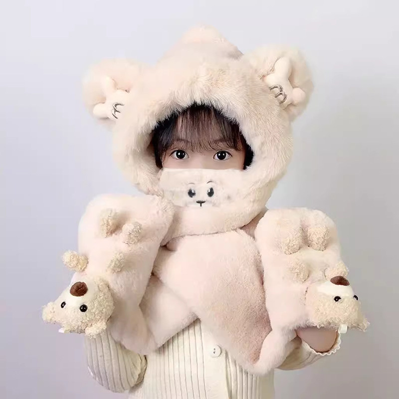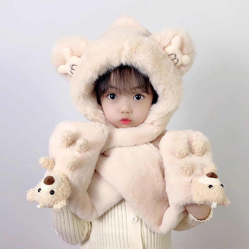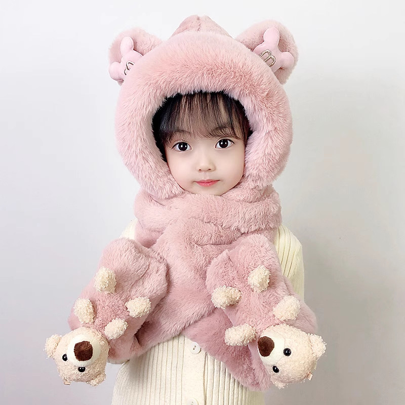 尼多熊儿童帽子围巾一体冬季防风帽宝宝毛绒护耳帽女童加厚保暖帽
